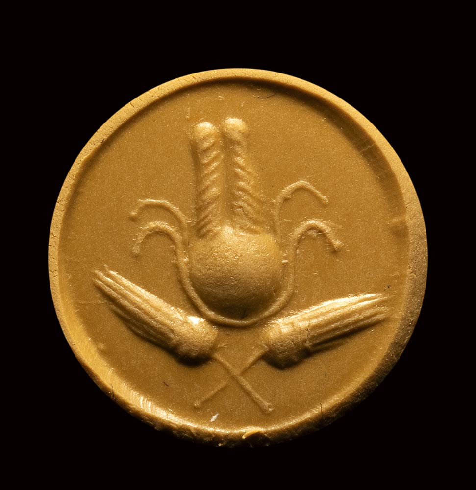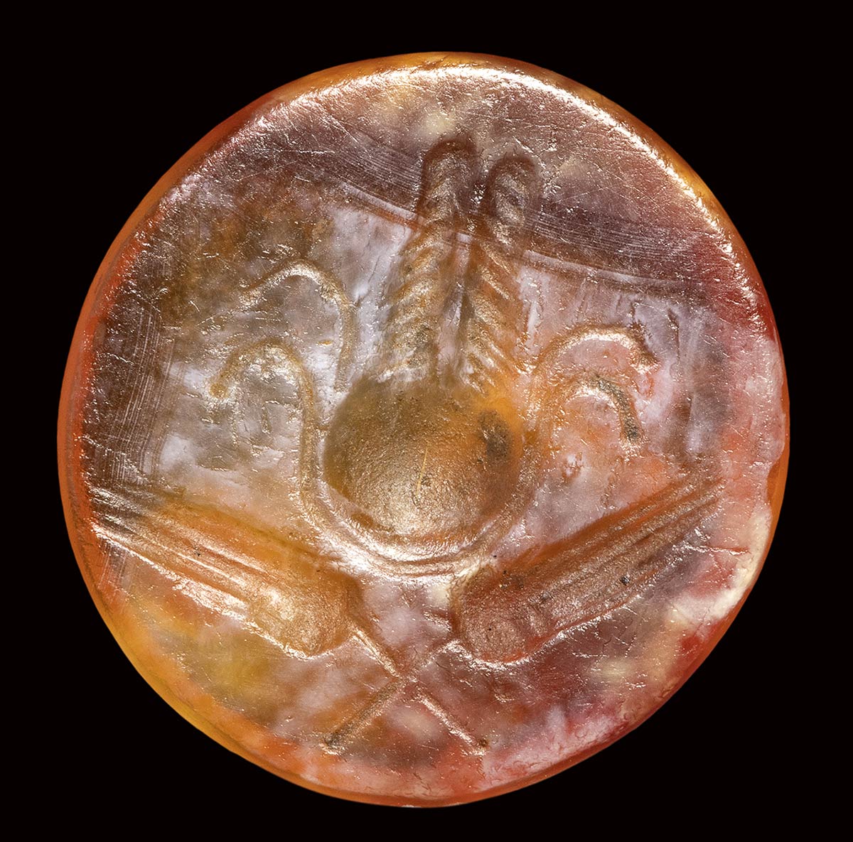 In the center, the Isiac emblema; below, two crossed ears of wheat. Surface slightly burned. Use of small globular elements.