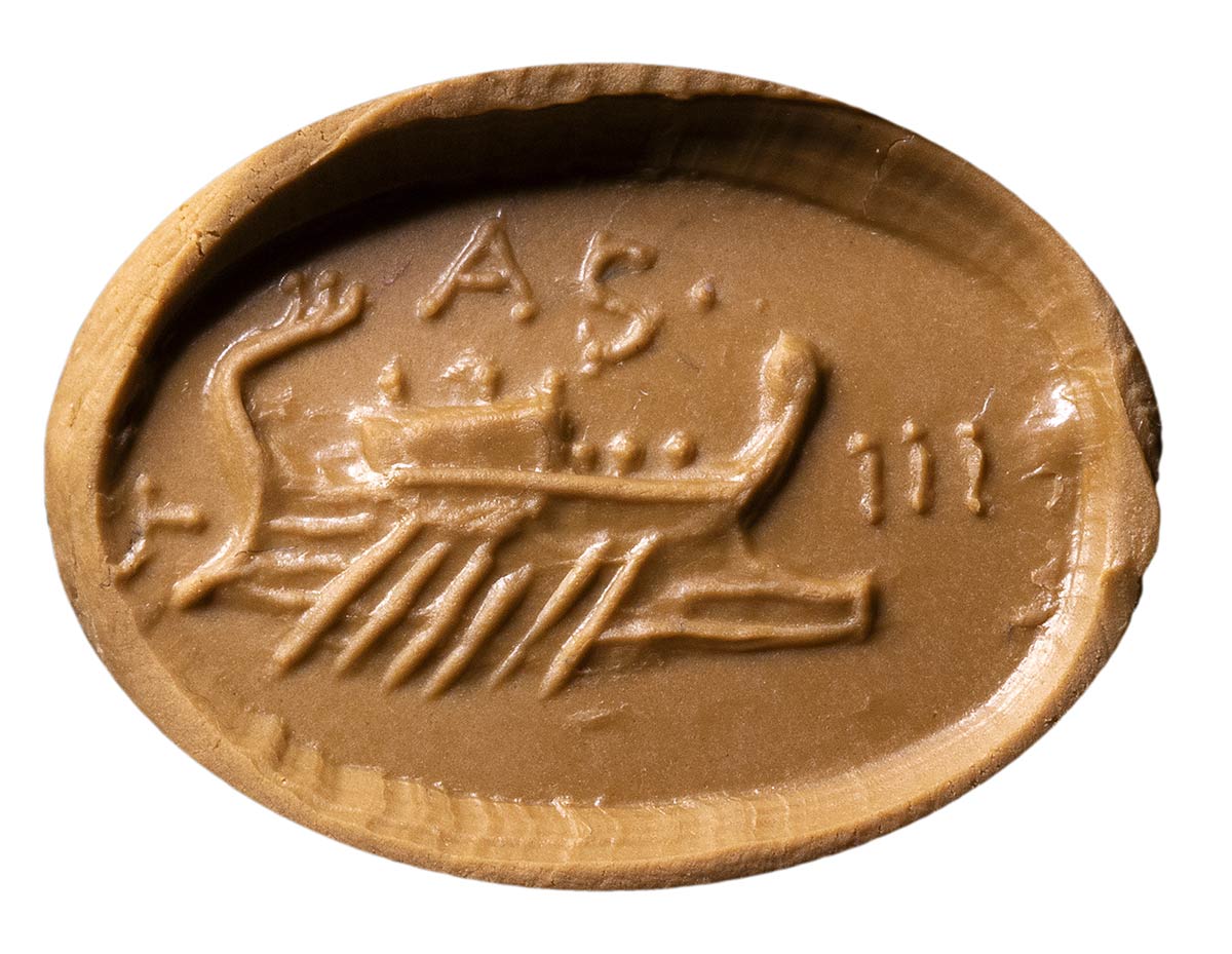 A trireme sailing right, on top two latin letters « SA » preceded by a globe. On the left of the ship the latin number « III ». The inverted direction of the letters suggests that the intaglio was used as a seal. With naval military symbolic. Use of globular elements.