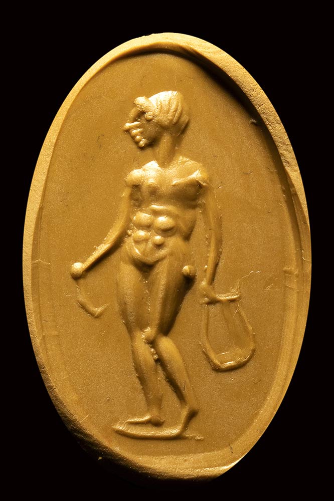 The male character is standing, naked and facing right. With his right hand he holds a lyra (?), While with his right a strigil (?). Groundline. Use of globular elements. Typical italic style. Large gem and attractive banded agate variety.