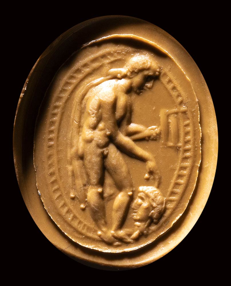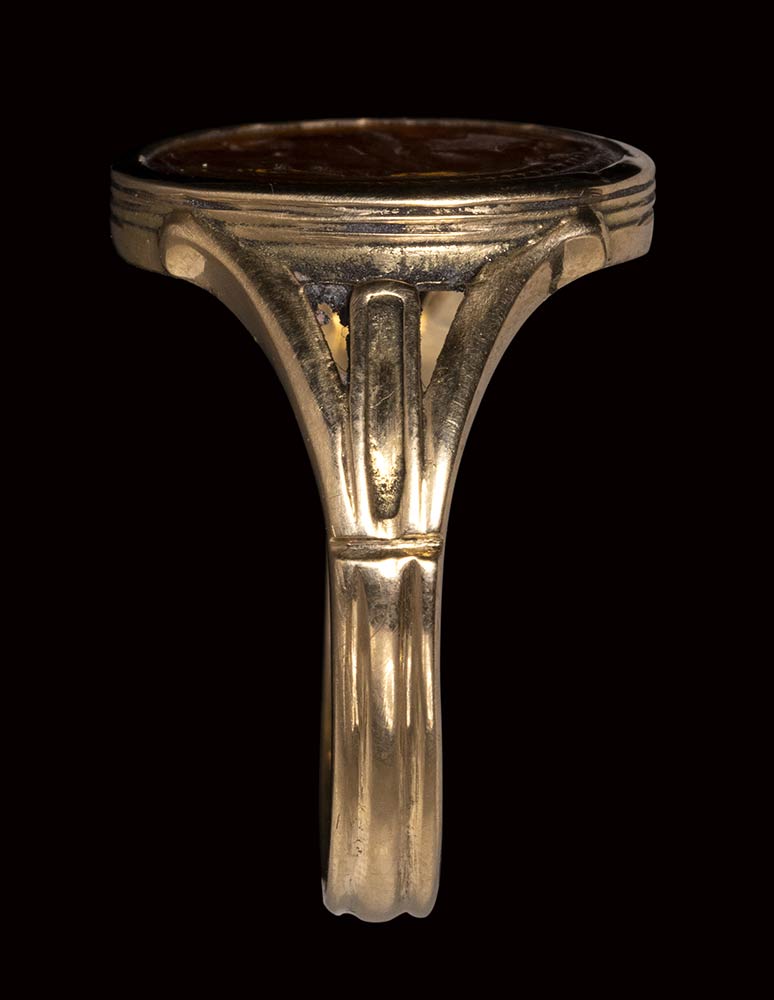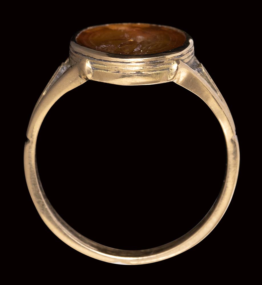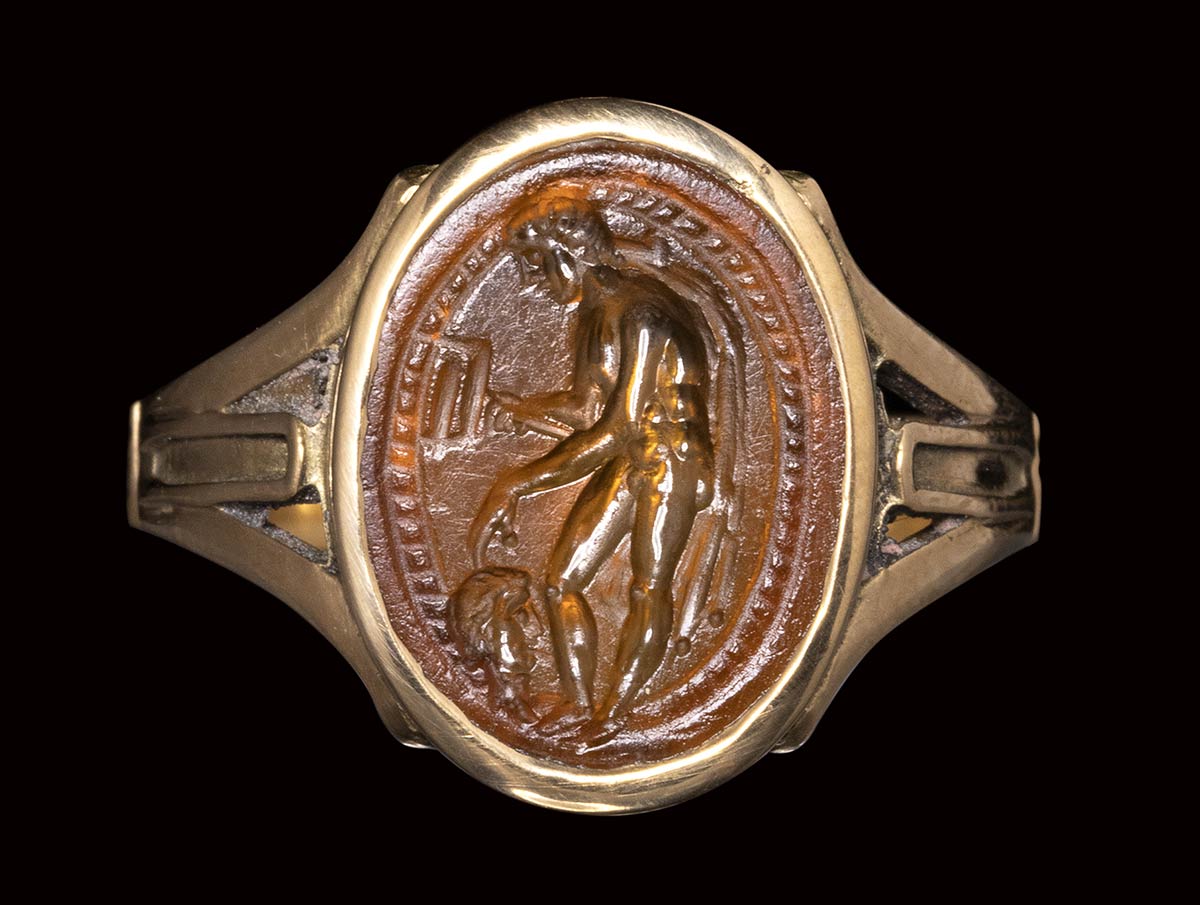 The standing god is facing left and slightly bent toward the ground. He is naked, his back covered by a cloak. His right hand holding the caduceus meanwhile with his left hand, the fingers delicately touch a male head, probably a deceased one that he must bring to the Underworld. This scene shows Hermes in his function of Psychopomp, the one that guides the death souls. This subject is probably referred to the Pythagoreanism. Use of globular elements. Hatched border. Nice polishing for the engraving, and signs of wears on the surface. The late 19th/ early 20th century gold mouting is made of a rounded hoop dividing in three sections on the shoulders and extending onto an oval box-setting with thin incised grooves. Parallels: AGDS, n. 60; AGDS Berlin n. 299. AGKM (Kunst, Wien) n. 126. G.M.A. Richter, Catalogue of engraved gems, The Metropolitan Museum of Art, New York, n. 225-226. AGDS Munchen, vol. 2 n. 723.