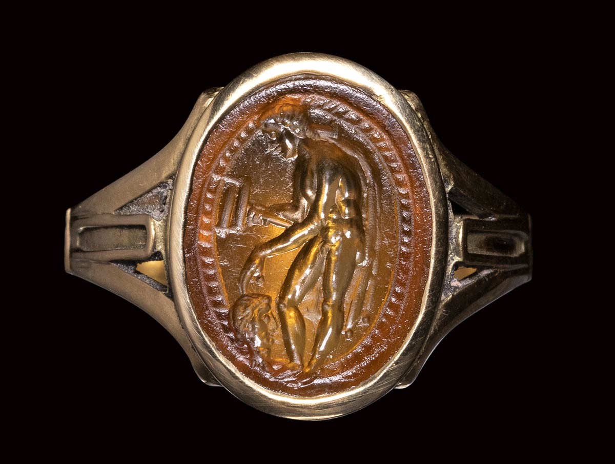 An italic sard intaglio set in a gold ring. Hermes psychopomp.<br><br>2nd century B.C.