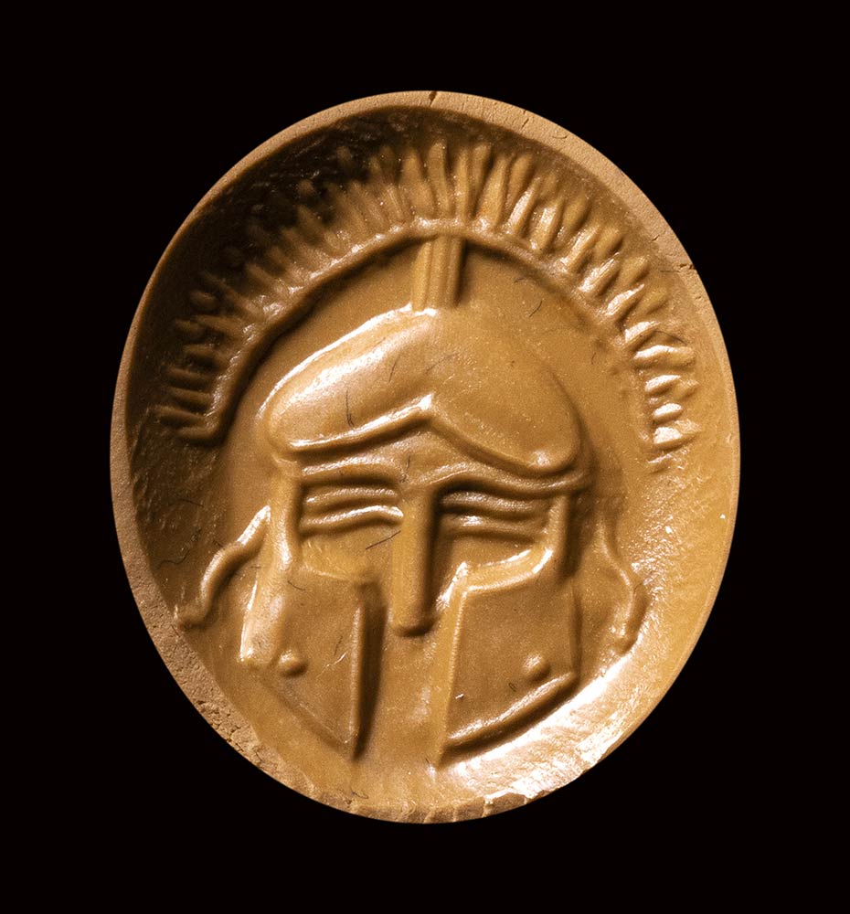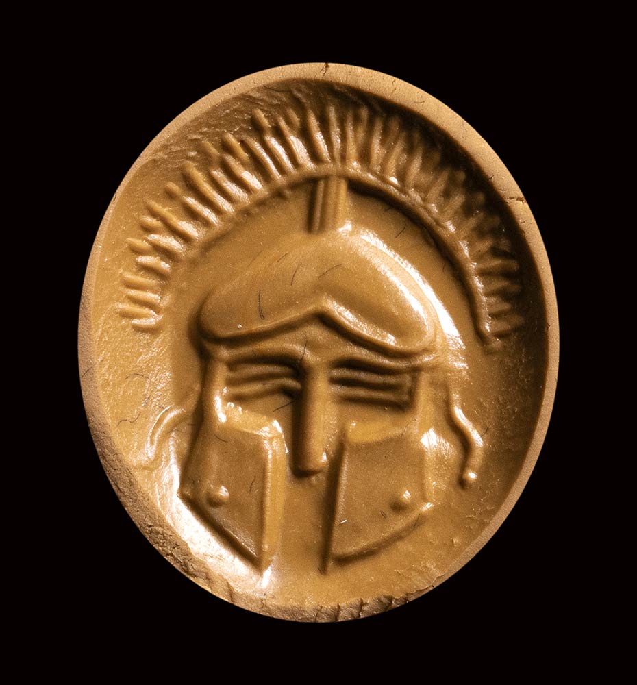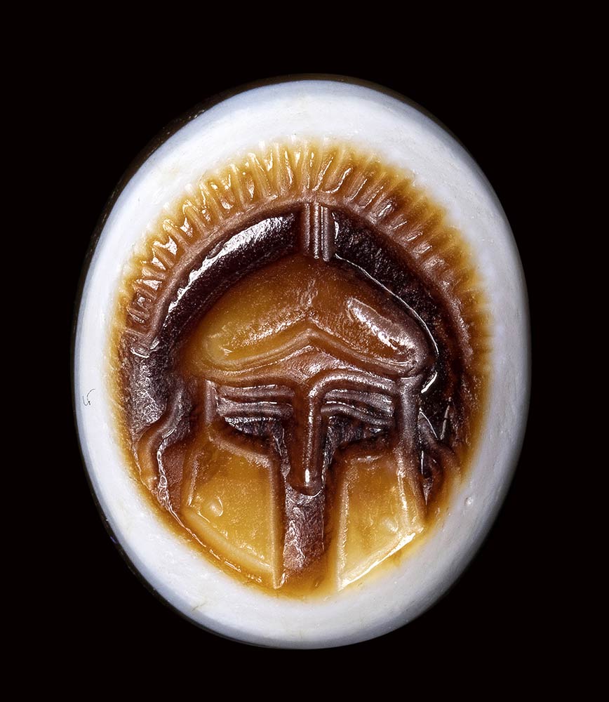 Frontal helmet with crest. Pierced lenghtwise. Wear marks. Beautiful three- layered sardonyx. 3rd - 2nd century B.C.