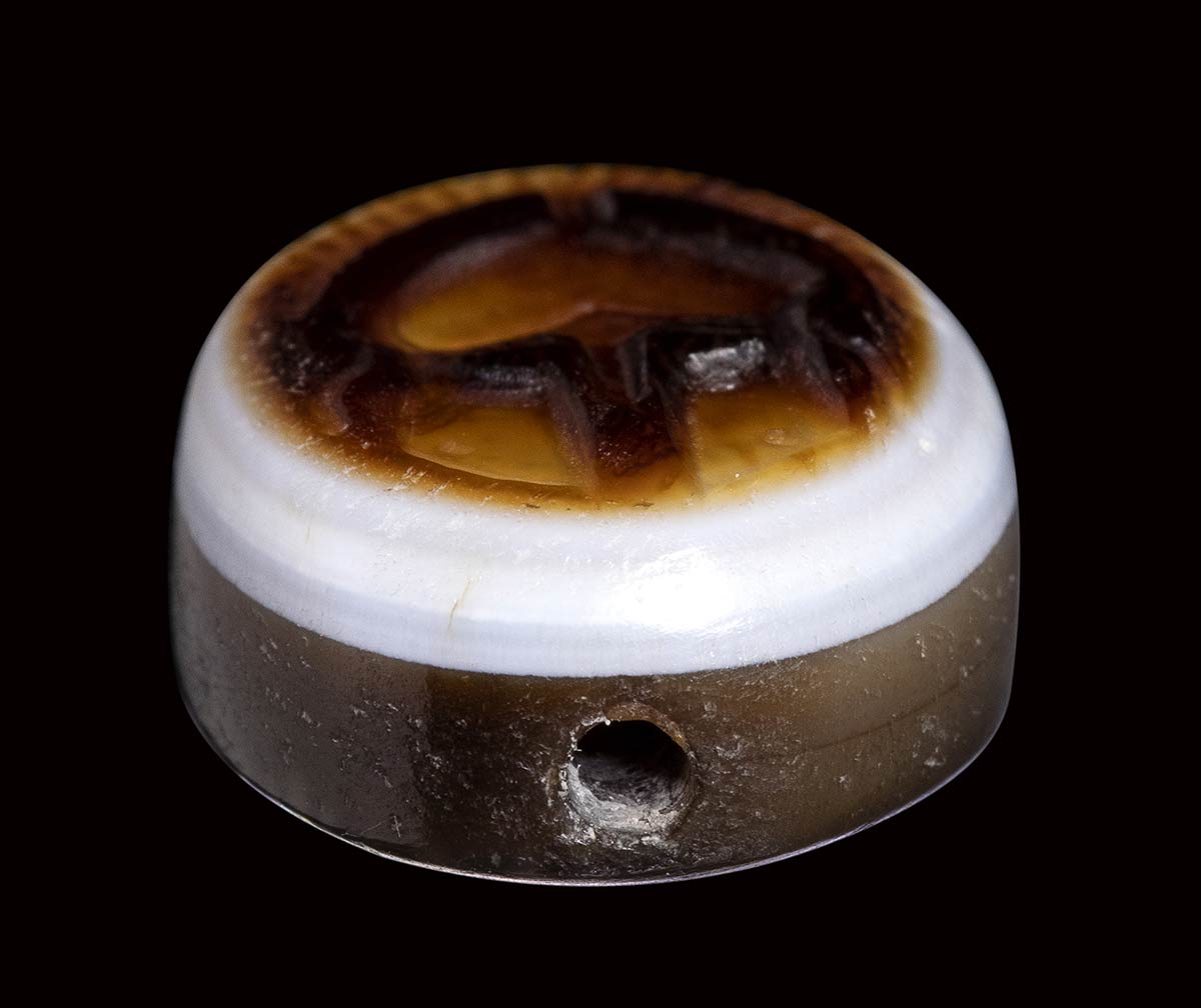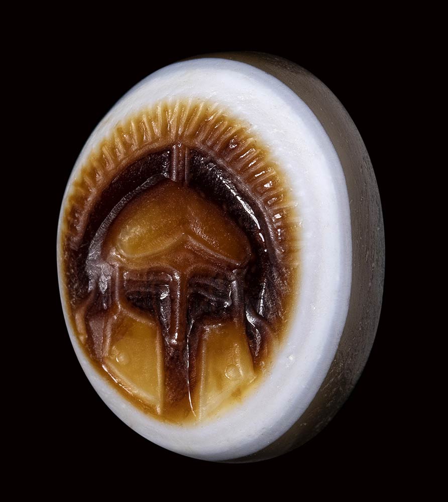 Frontal helmet with crest. Trough hole. Wear marks. Beautiful three layers sardonyx. Parallel: greek coinage cfr. Thrace. Mesembria. Diobol. s. IV BC. (SNG BM Black Sea-268/271). (Topalov, Messambria-8). (Karyatov I-37/38). Anv.: Frontal helmet. Rev.: wheel with META within the spokes and radiant lines on the edge.