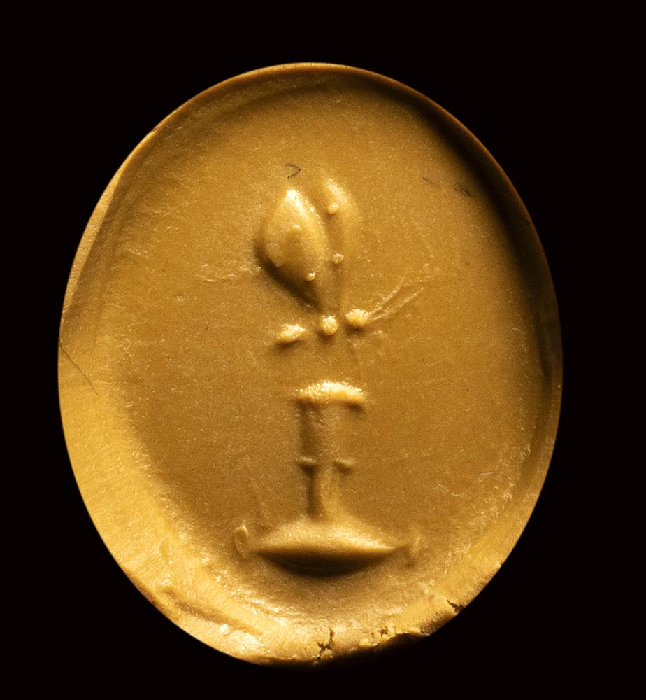 Very fine and elegant allegorical emblem with a butterfly resting on an object to be identified (ampoule?). Slight wear marks.