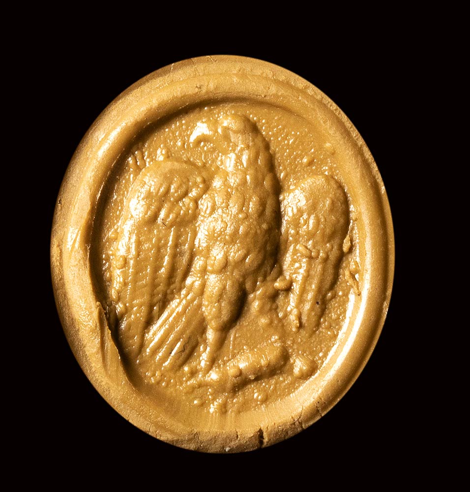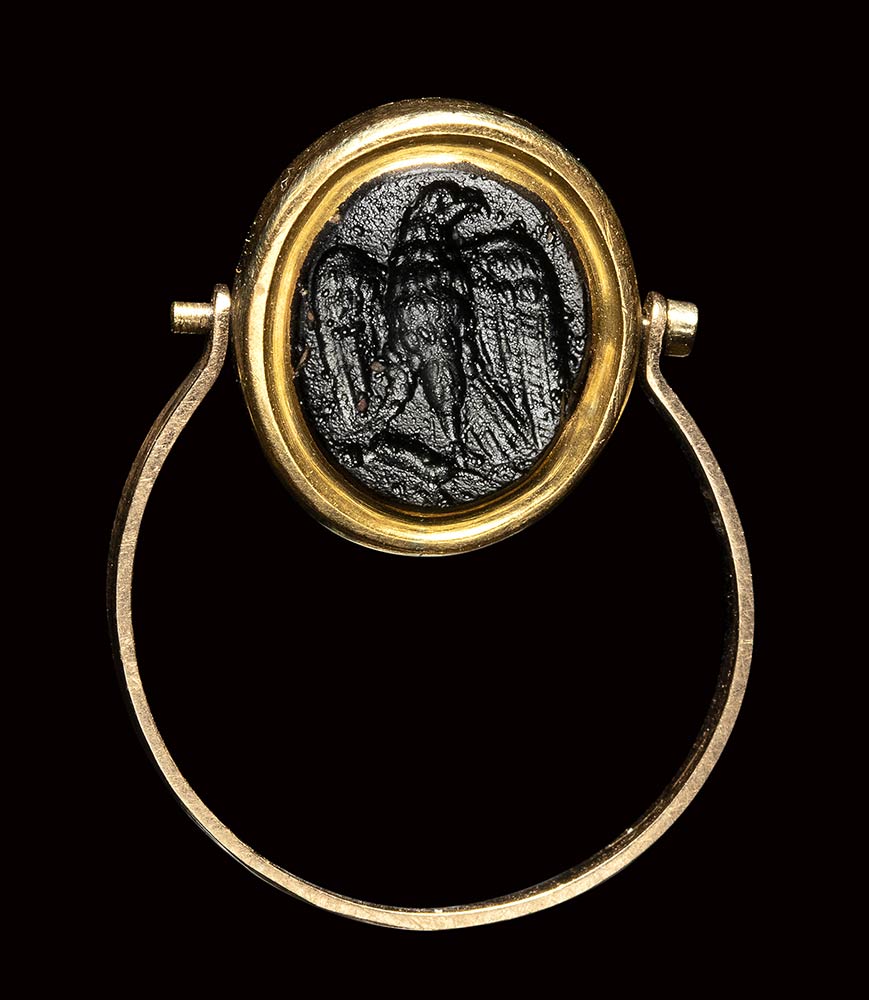 The animal is depicted frontally, with its wings open and the head turned in profile. With his claws he grabs a boar's head. Emblem of imperial military power. Wear marks. Little missing on the mounting. Parallel: For a same glass paste intaglio see Metropolitan Museum of Art database, inv. n. 17.194.56.