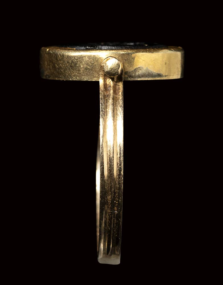 A roman dark glass paste intaglio set in a gold swivel ring. Eagle.<br><br>1st - 3rd century A.D.