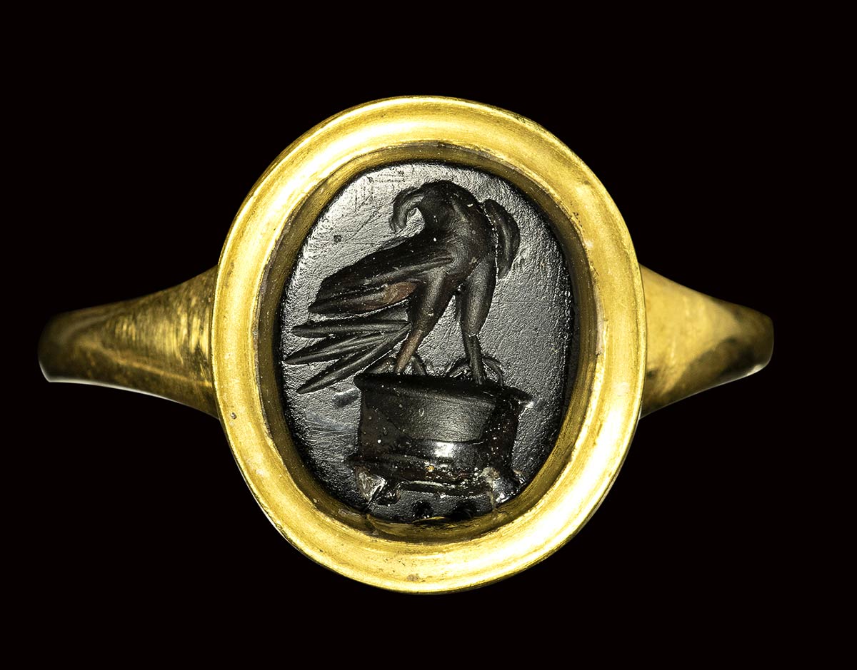 A roman obsidian intaglio mounted on a modern gold ring. Eagle on altar. 2nd century A.D.
