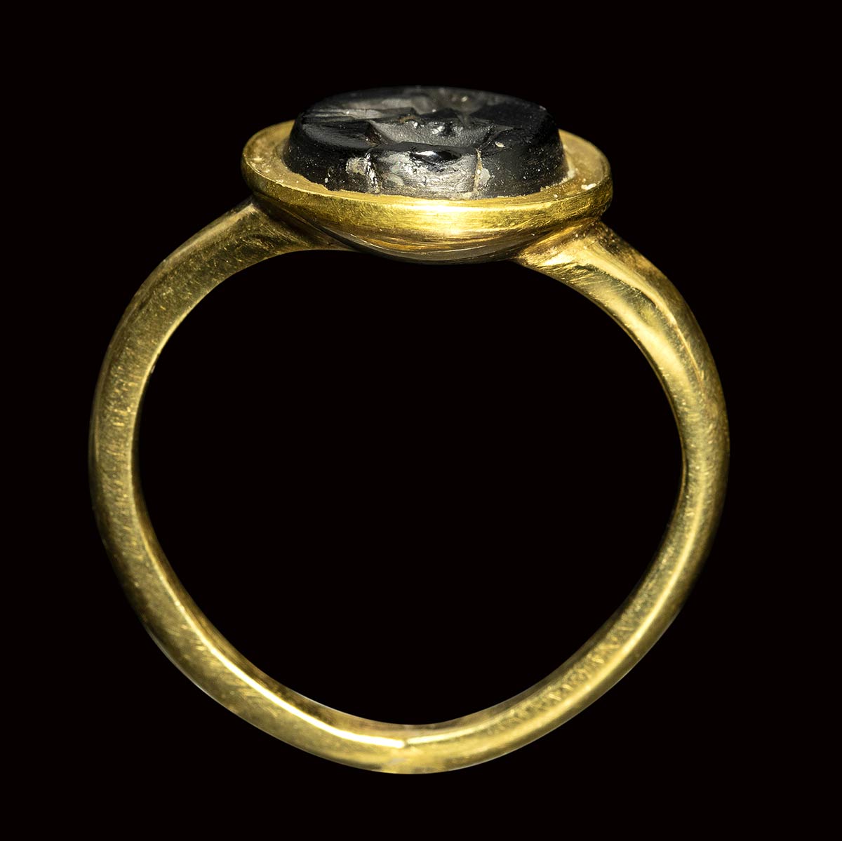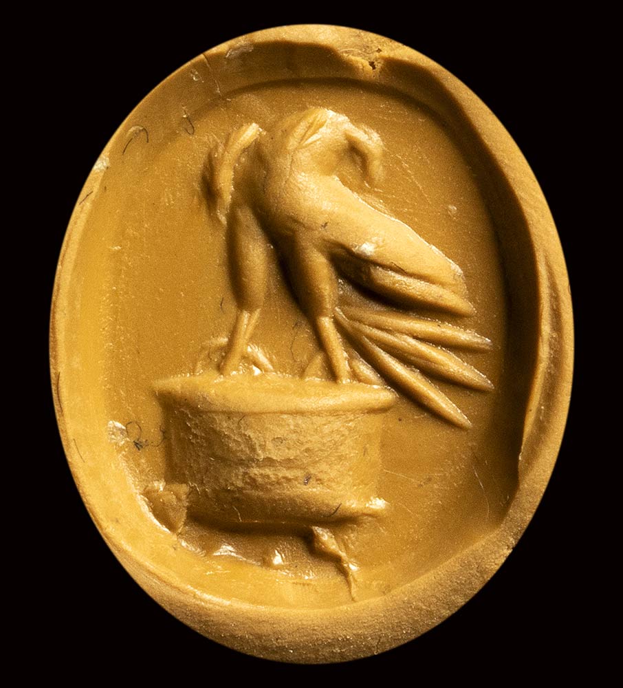 Lotto 81 | A roman obsidian intaglio mounted on a modern gold ring. Eagle on altar. 2nd century A.D.