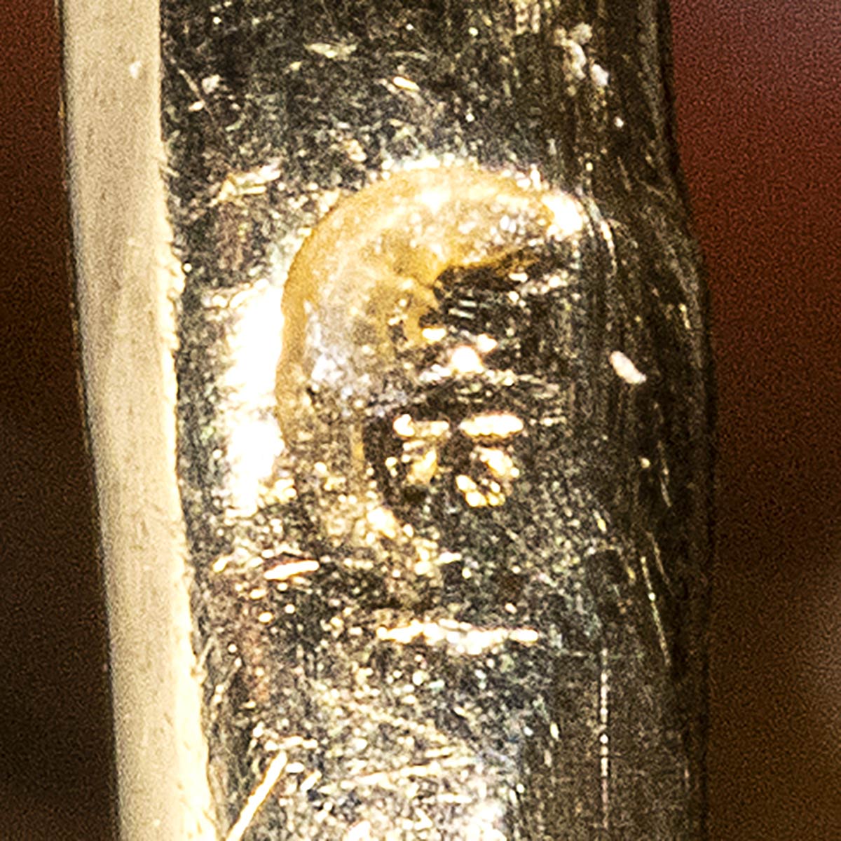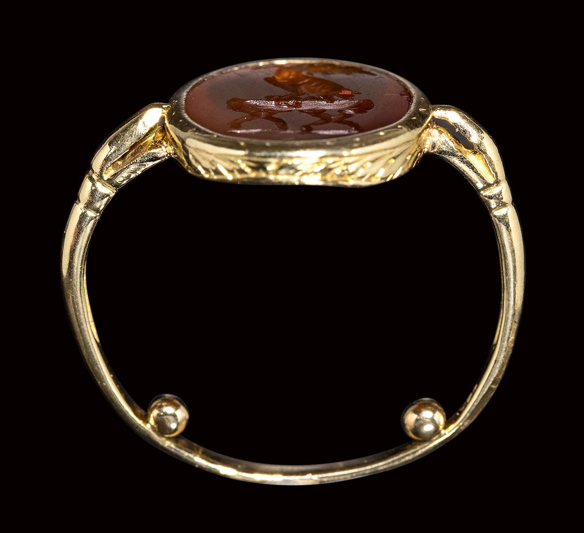 The intaglio shows an eagle with the head turned right holding a laurel branch in its beak. He is standing on a crossed-legs stand. Allegory of military power of the roman Empire. Slight wear marks on the surface of the stone. The gold mounting is with rounded hoop, within two spherical beads on each side. The shoulders with engraved lines are ending in foliage. The rounded box-setting with engraved leaves motifs. Hallmark on the hoop.