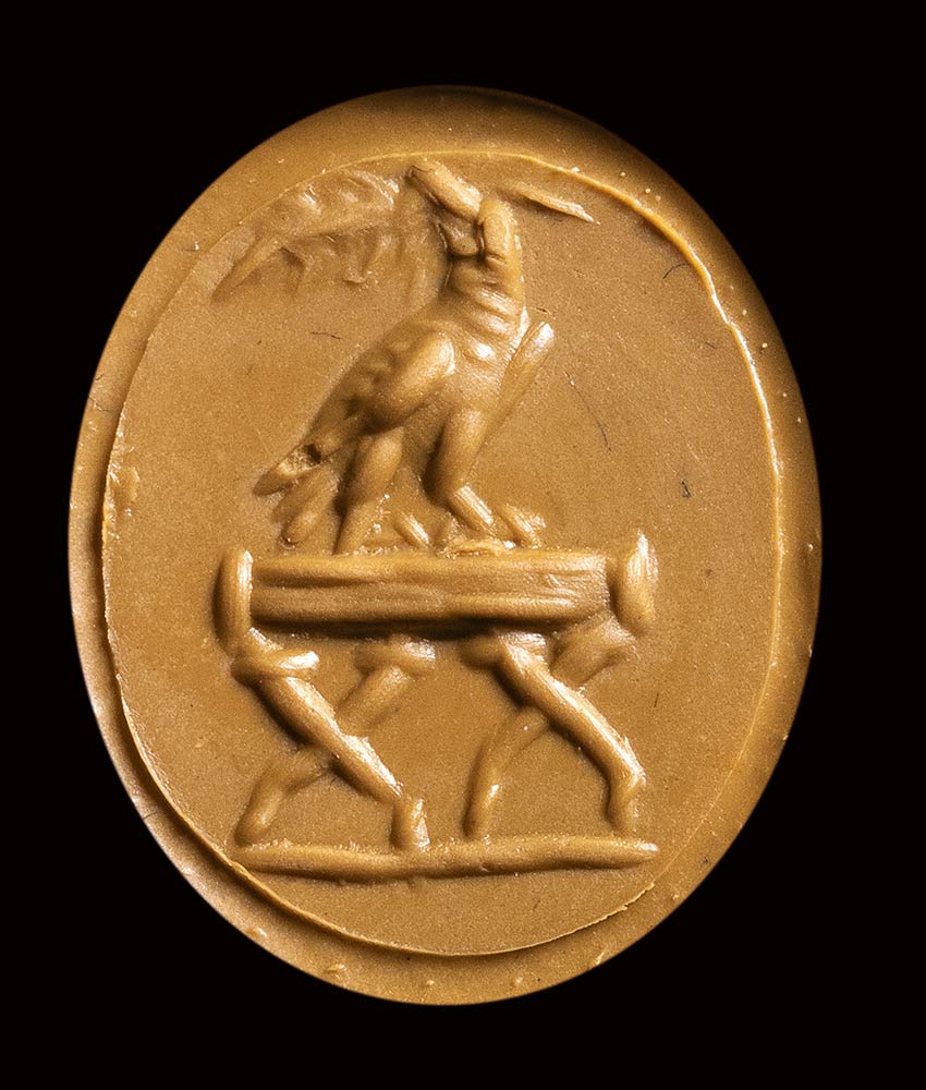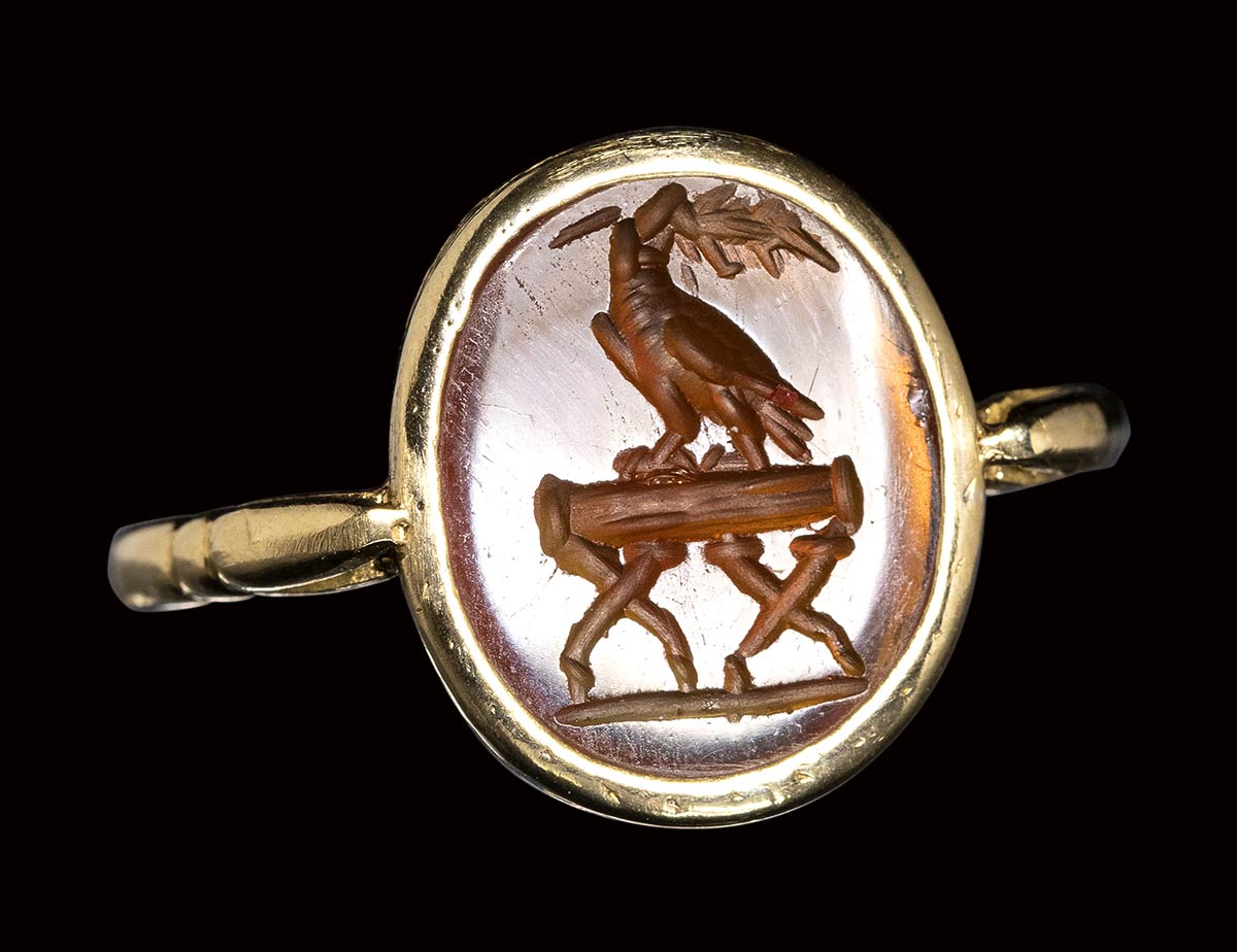 A roman carnelian intaglio mounted on a modern gold ring. Eagle on a stand. 2nd century A.D.