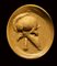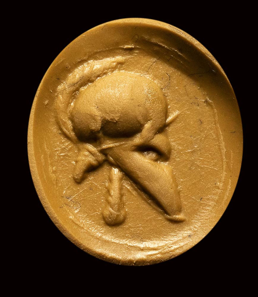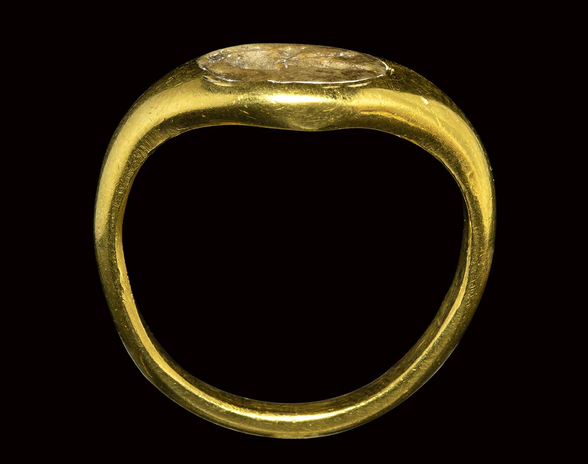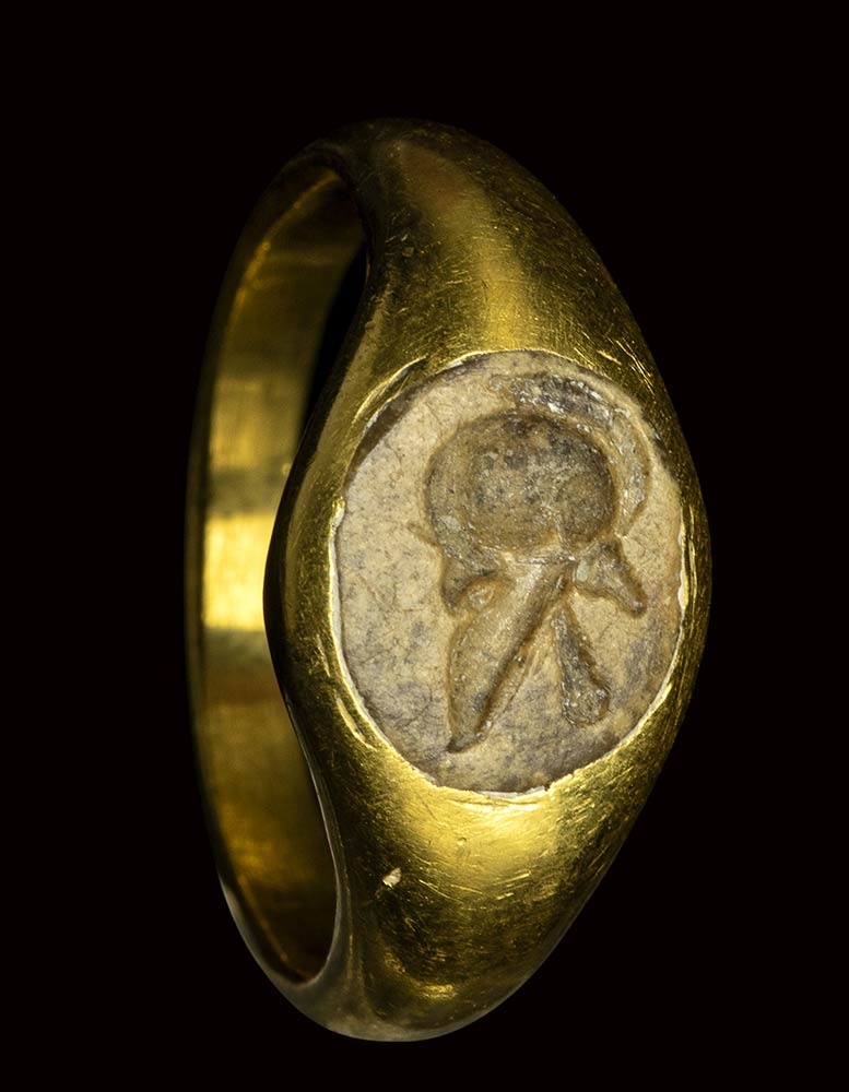 The crested helmet is formed with a wild boar’s head. The gold mounting is with rounded hoop, flatten within and extending at the shoulders with an oval bezel. Signs of use on the surface of the stone.