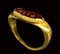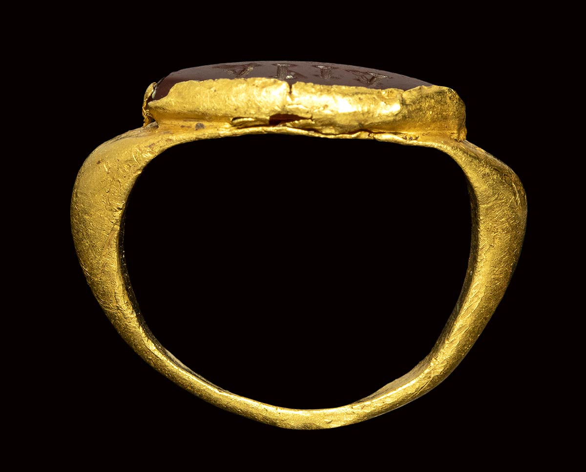 A late roman gold signet ring set with a carnelian intaglio. Greek letters.<br><br>Early 3rd century A.D.