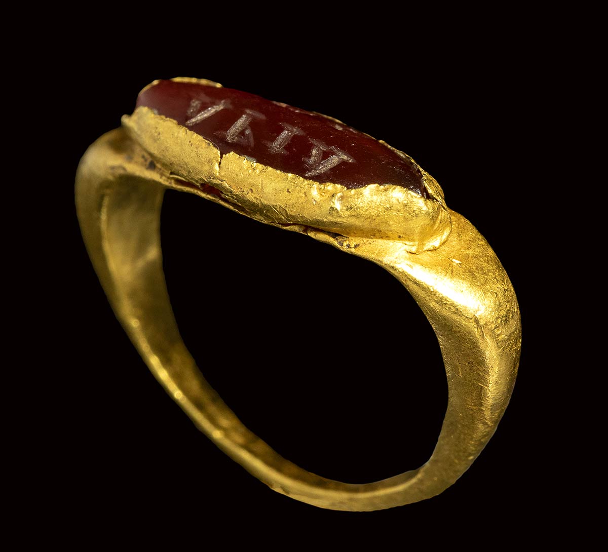 A late roman gold signet ring set with a carnelian intaglio. Greek letters.