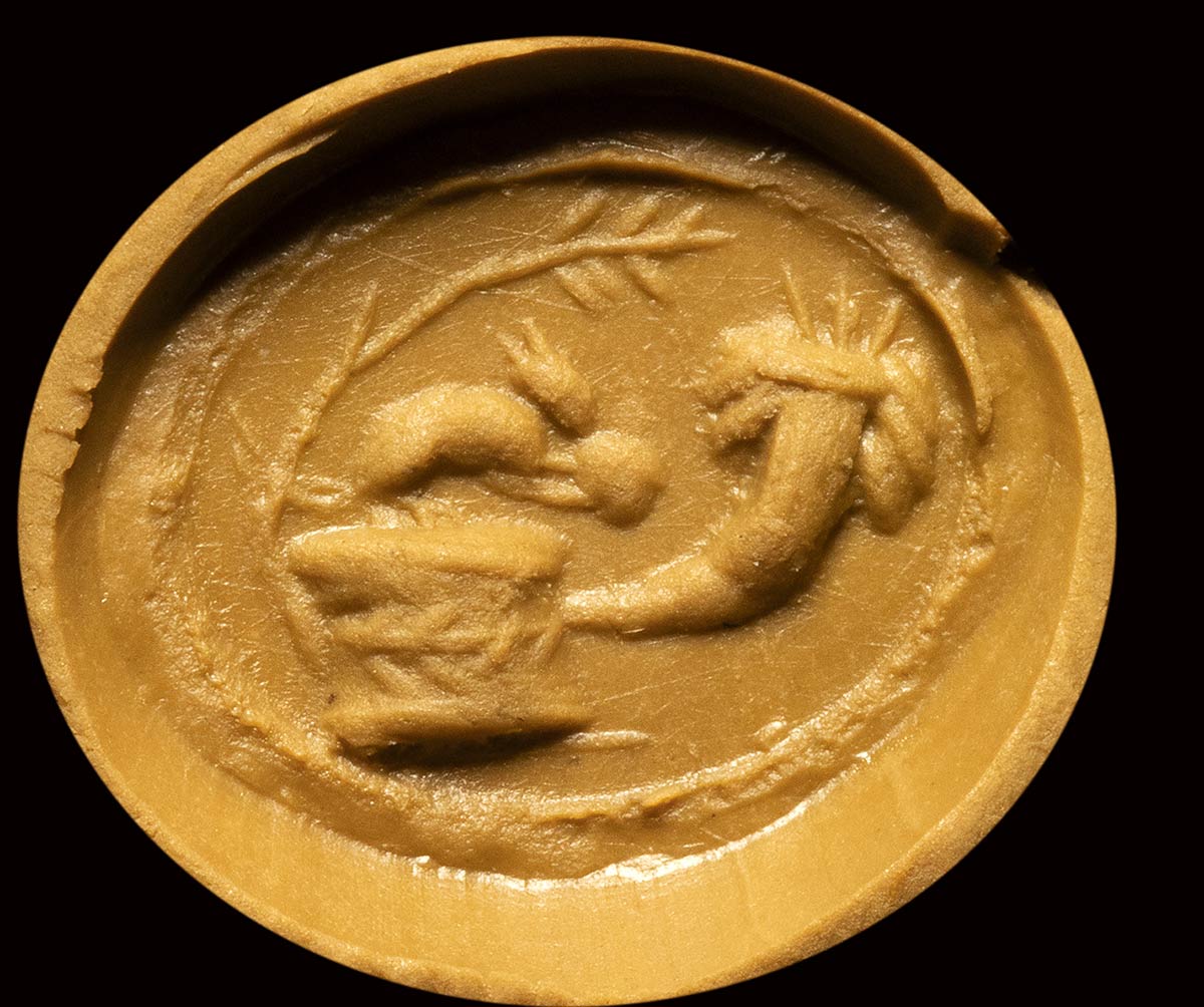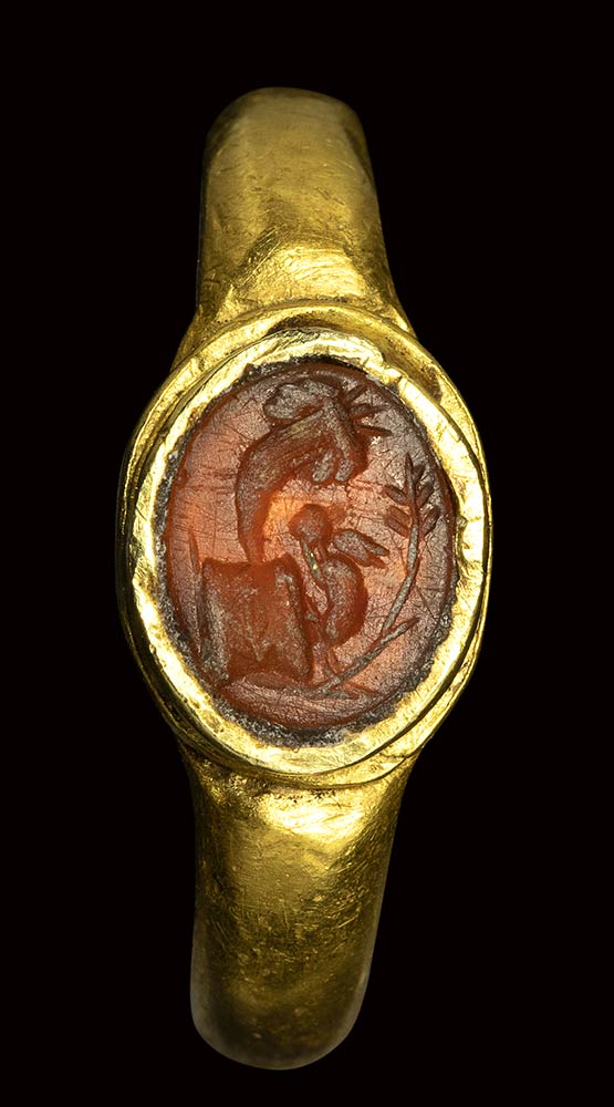 A roman carnelian intaglio set in a gold ring. Allegorical emblema. <br><br>2nd century A.D.