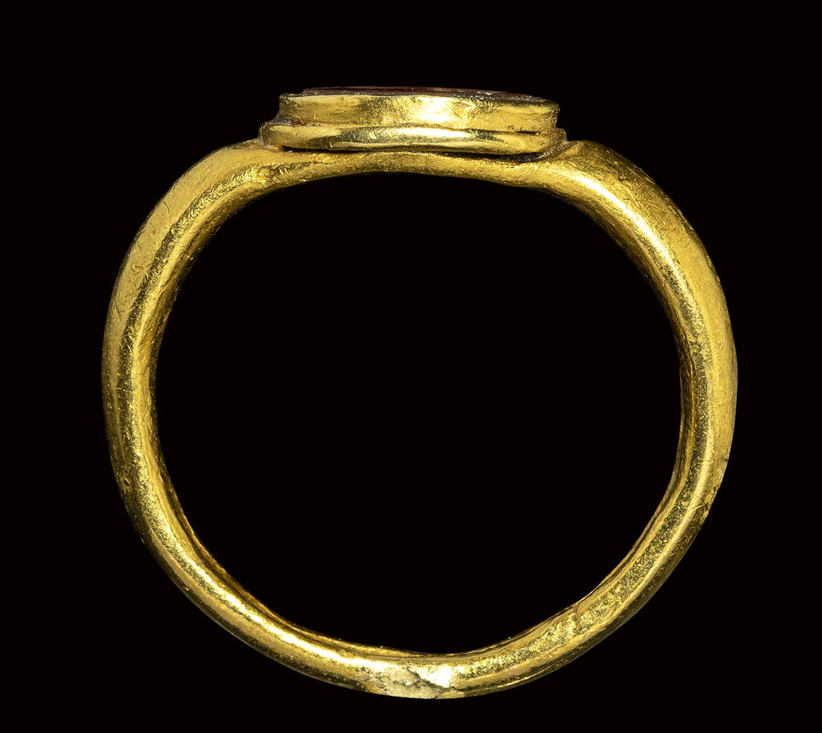 Hoop rounded without and within extending on the shoulders with embossed angles. The box-setting made of two oval levels containing a carnelian intaglio depicting a cornucopia, a basket (kalathos), a mouse (?) holding a grape, a branch. Allegory of abundance and prosperity. Slight wears marks on the surface of the stone.