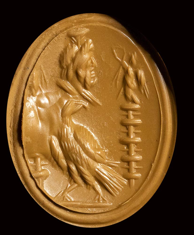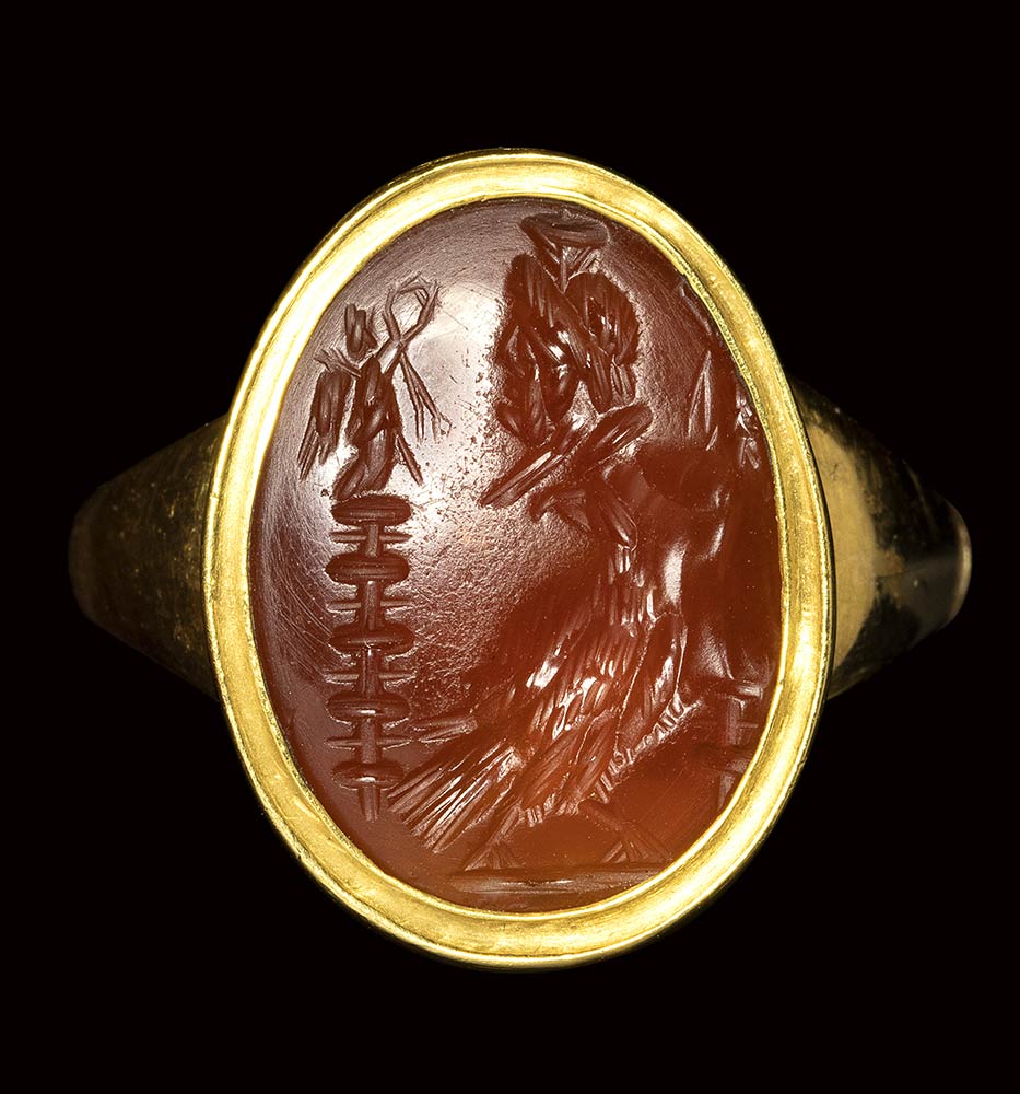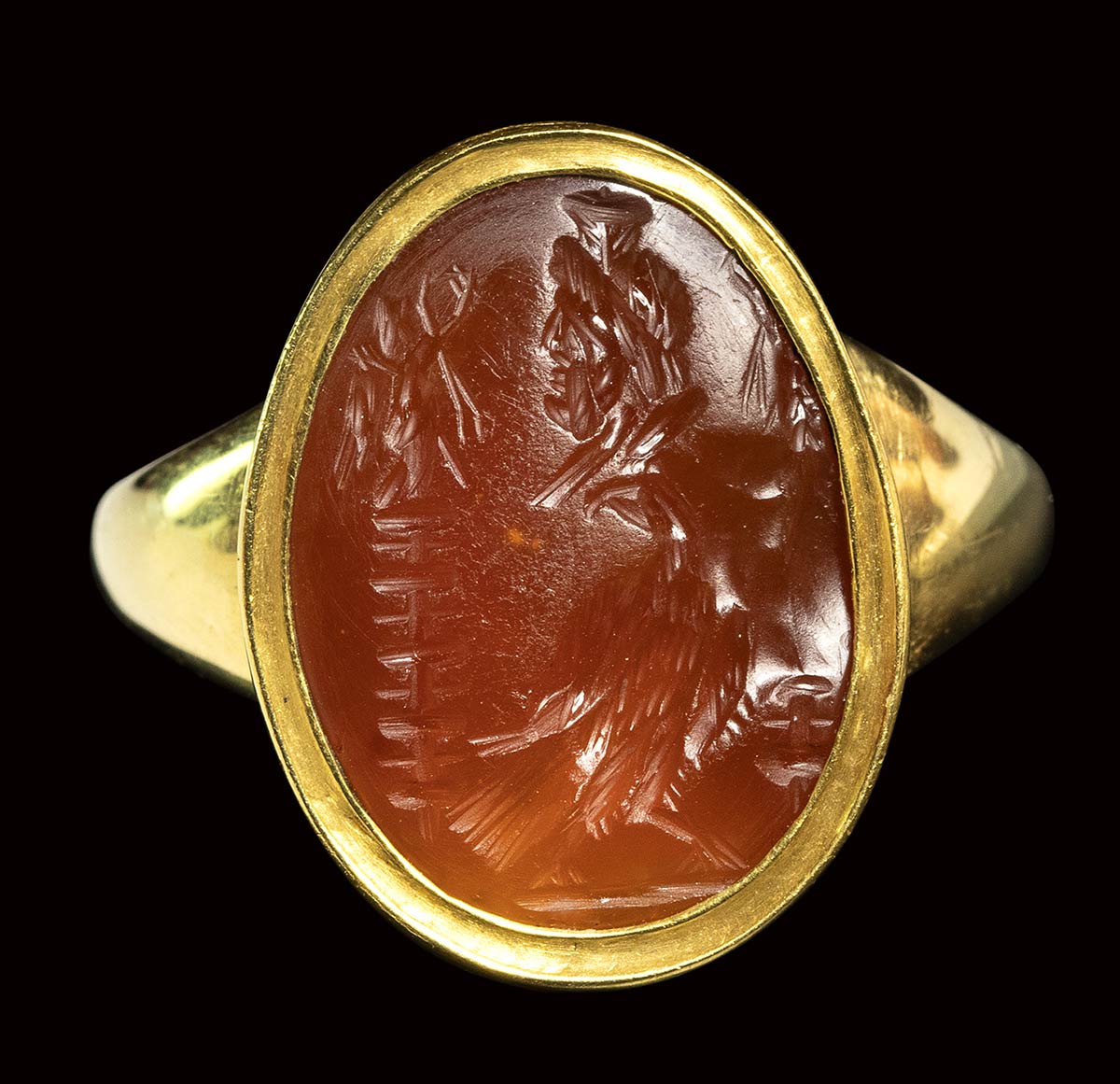 A roman carnelian intaglio set in a gold ring. Allegory of Zeus Sarapis. <br><br>2nd - 3rd century A.D.