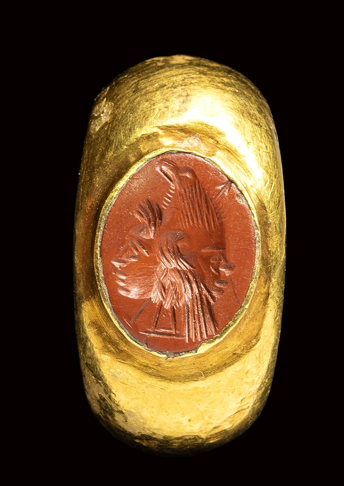 A roman red jasper intaglio set in an ancient gold ring. Gryllos.