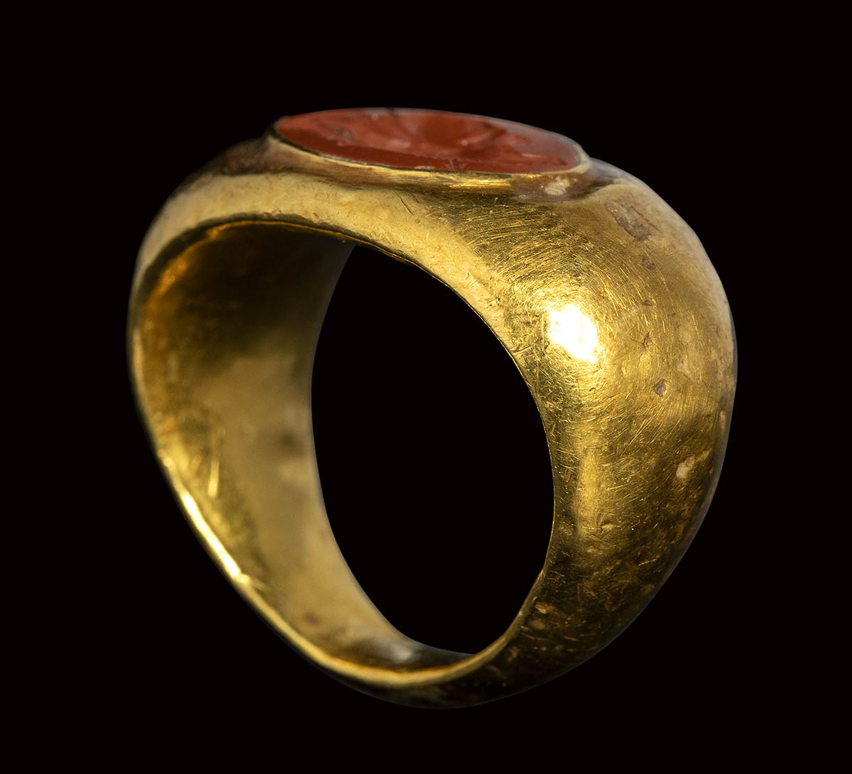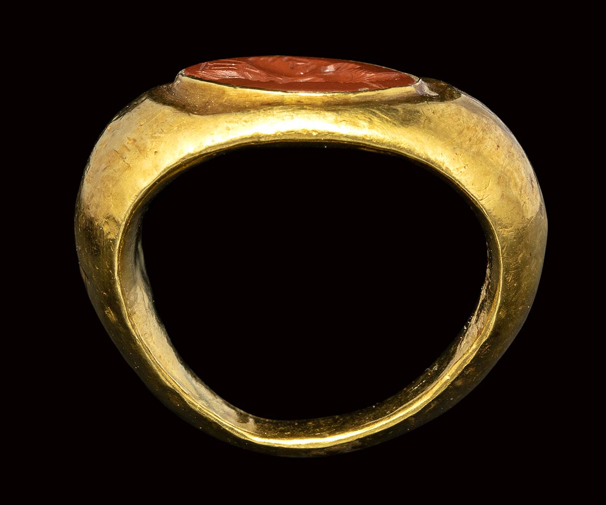 A roman red jasper intaglio set in an ancient gold ring. Gryllos.<br><br>2nd - 3rd century A.D.
