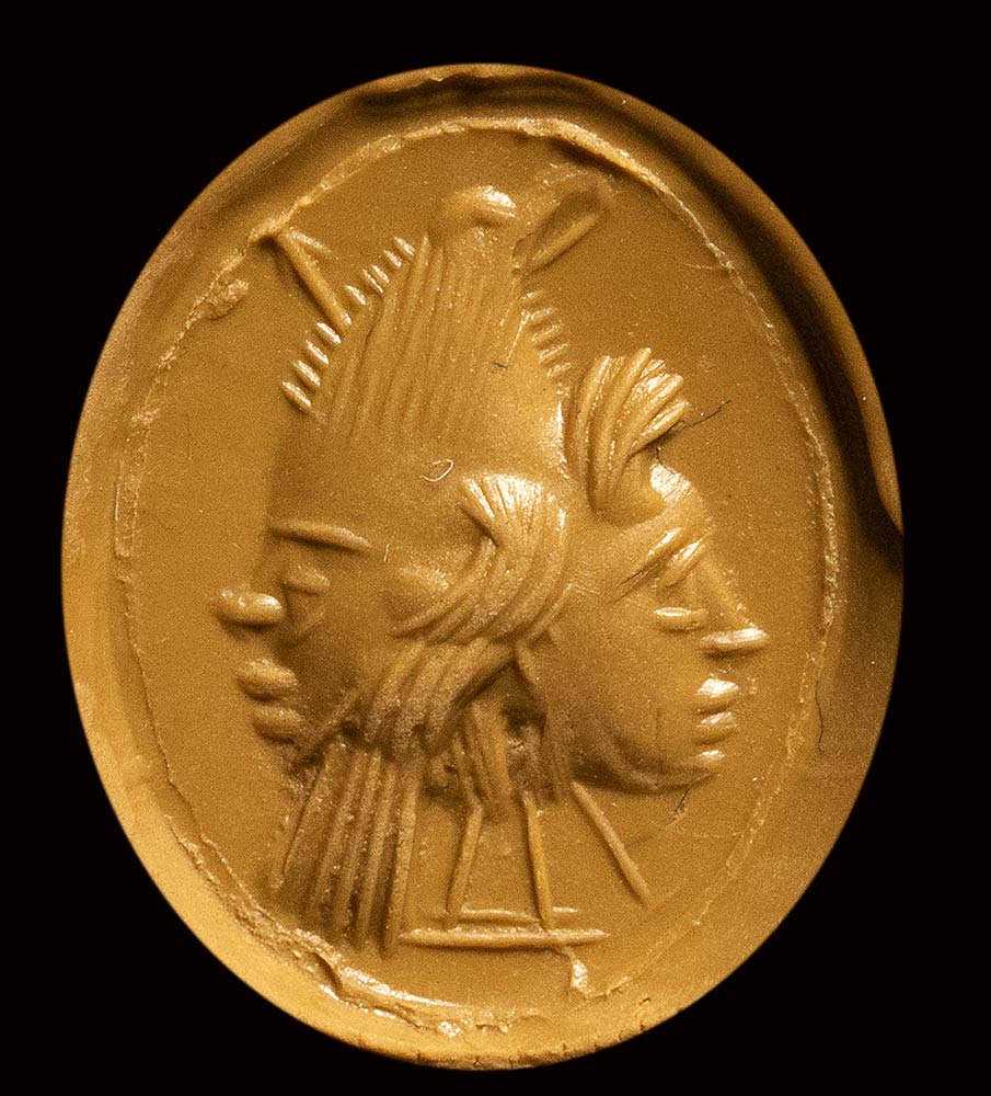 The hybrid creature is composed of an eagle's body, to which two heads are joined. The head in front can be identified with young a satyr, while on the back a Silenus's face. Behind, a spear. Probably a military apotropaic emblem. Ancient gold ring in good condition.