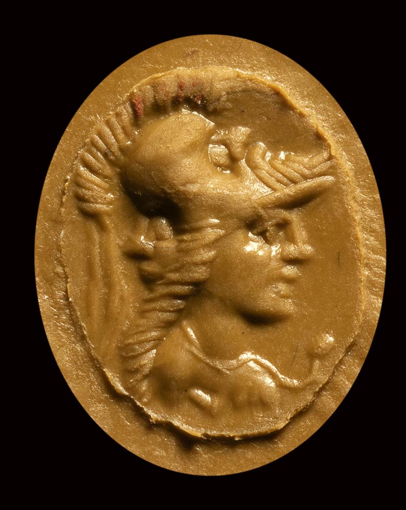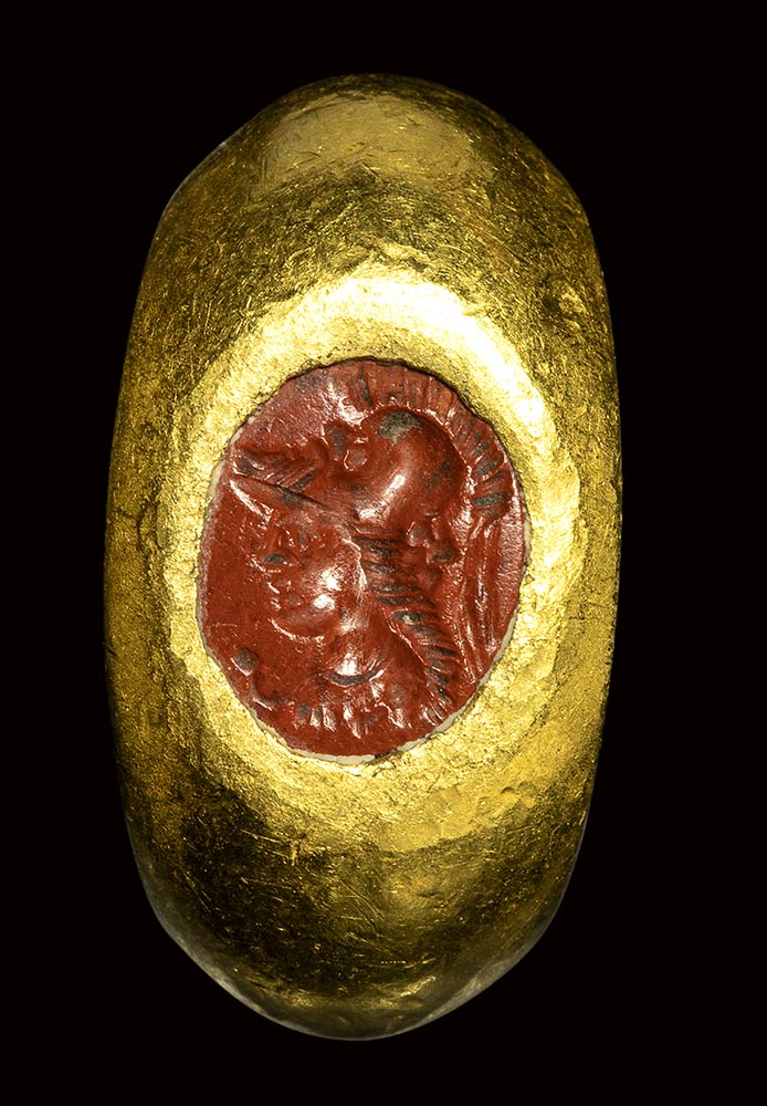Plain hollow hoop, expanding into broad shoulders and oval bezel with an oval red jasper intaglio: gryllos formed with a corinthian helmet with two male heads and bust of Minerva turned left.