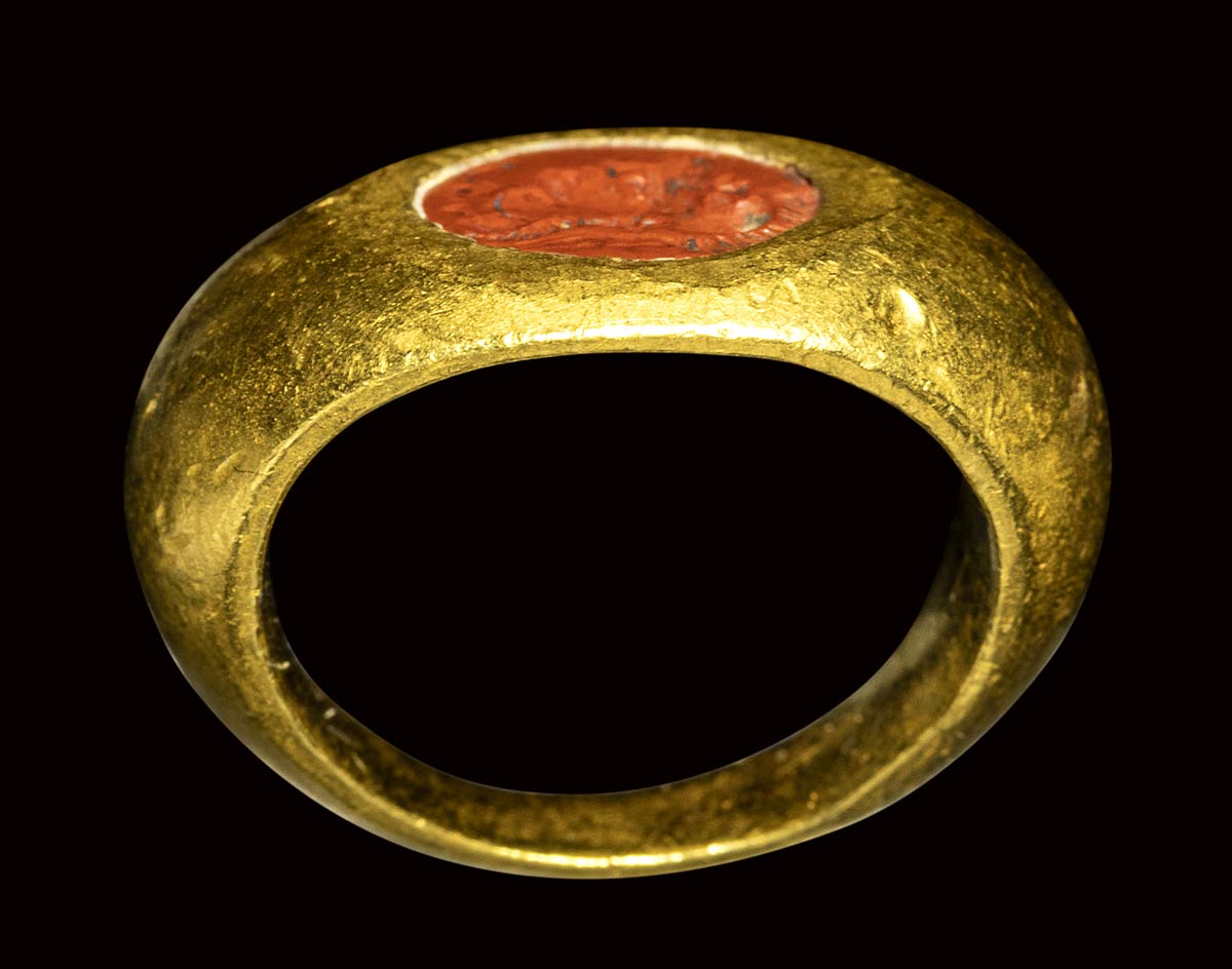 A roman red jasper intaglio mounted in a gold ring. Gryllos.<br><br>2nd century A.D.
