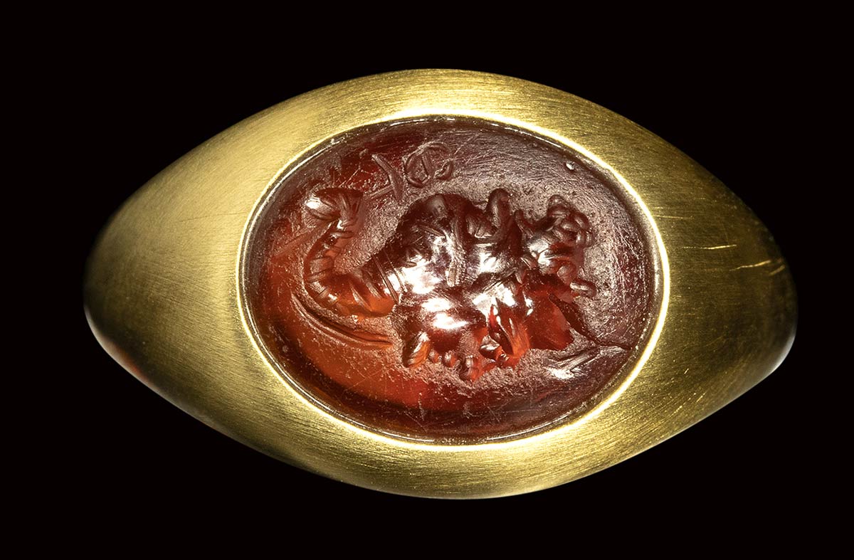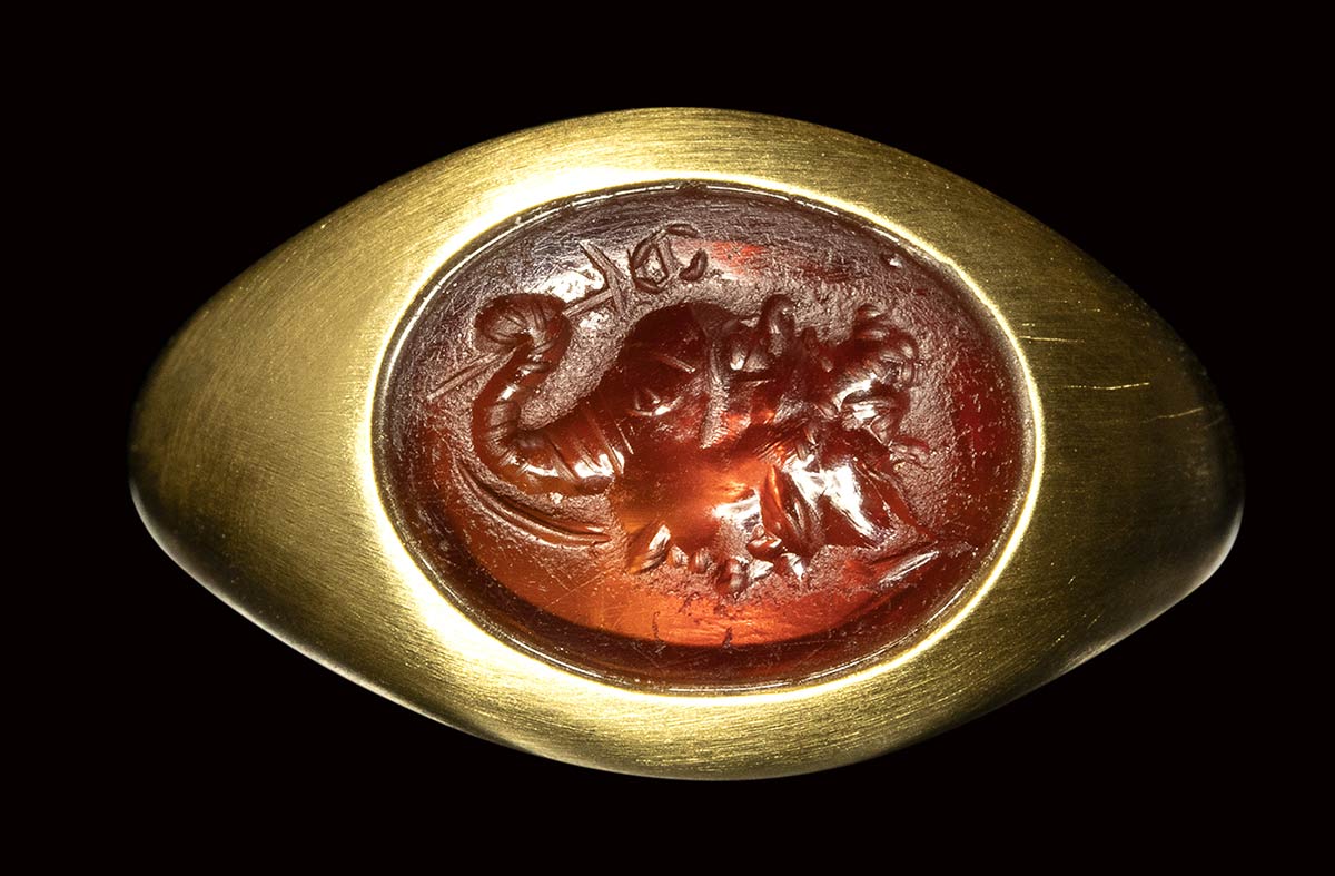 Lotto 117 | A roman carnelian intaglio mounted in a modern gold ring. Gryllos. <br><br>1st - 2nd century A.D.