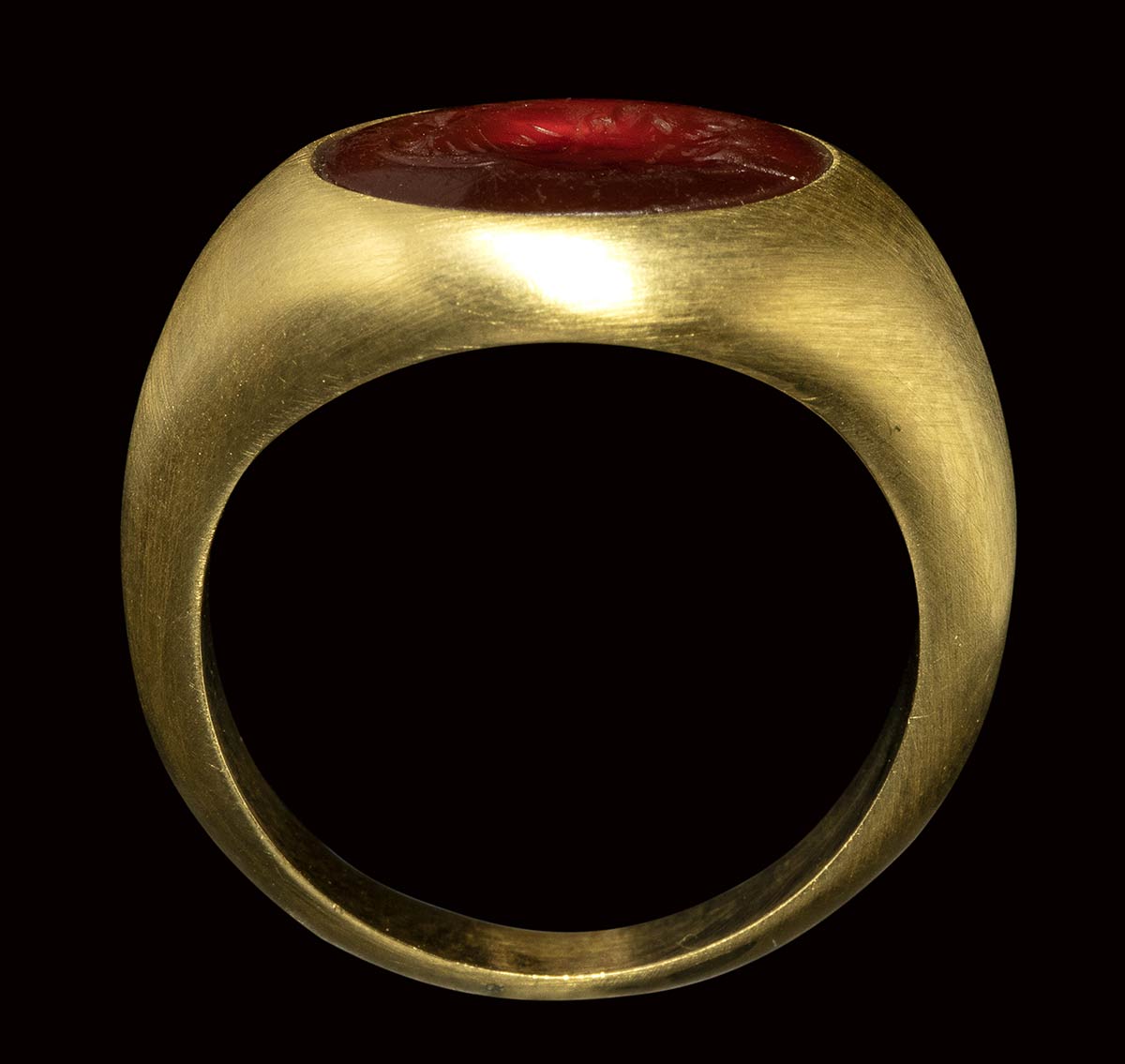 A roman carnelian intaglio mounted in a modern gold ring. Gryllos.
