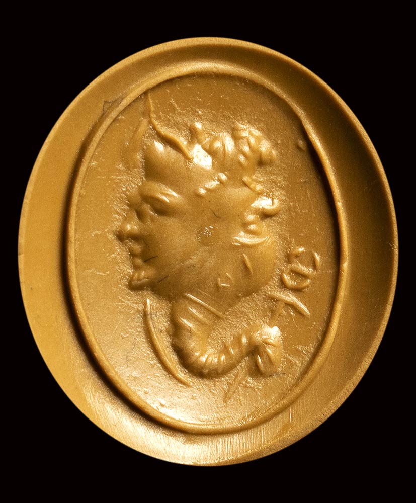 The scene depicts a gryllos with four conjoined heads; an elephant head with a caduceus in its trunk, a Silenus head with beard, a satyre head, and head of a woman. Apotropaic intaglio with reference to Africa. The modern gold mounting is made of rounded hoop with broader shoulders and oval bezel.