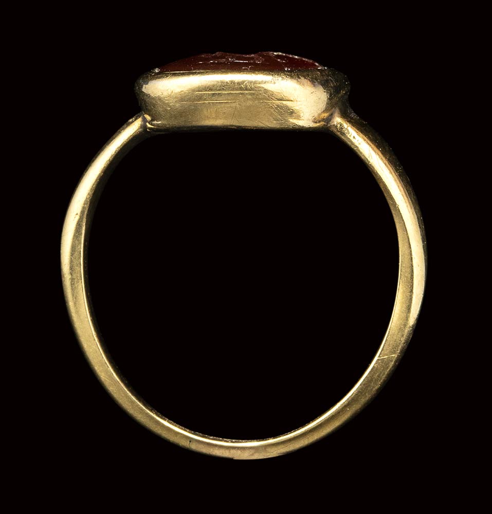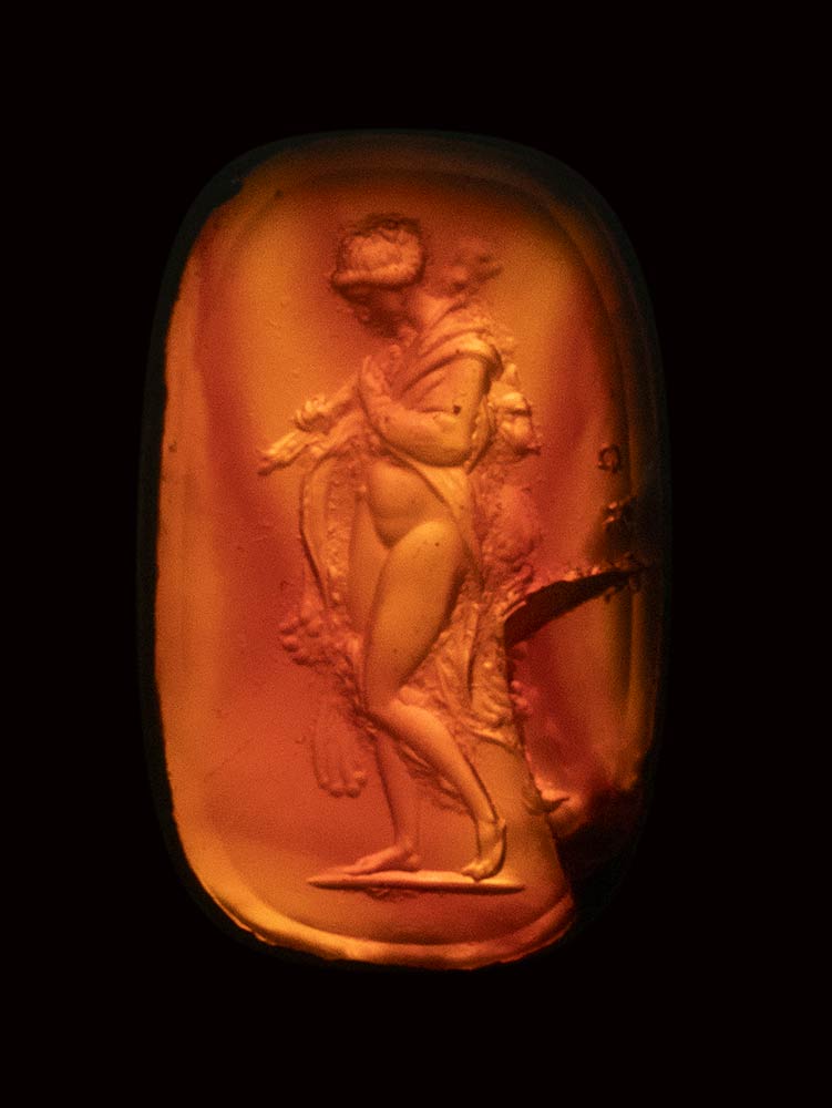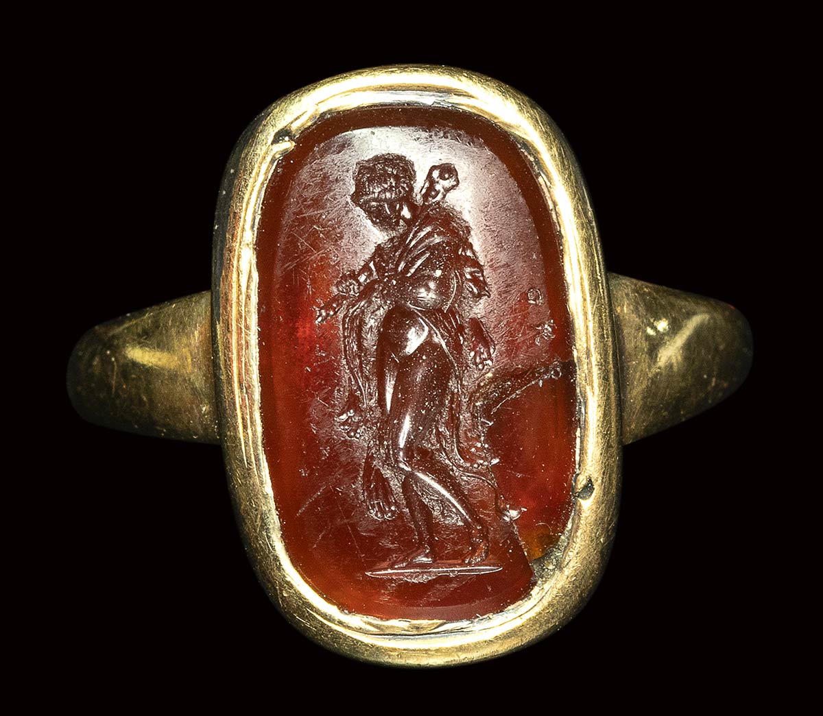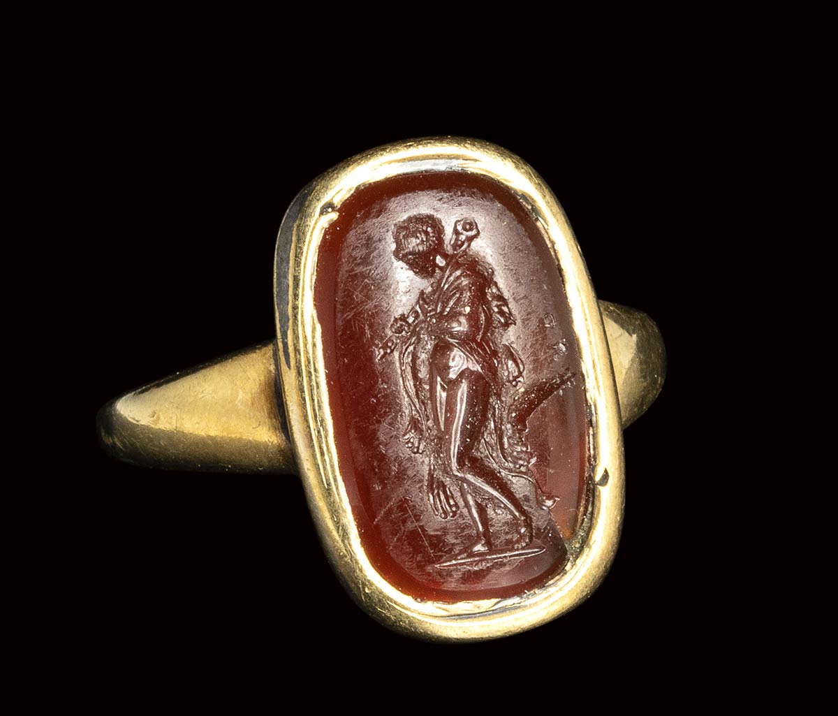 A fine early roman carnelian intaglio set in a gold ring. Omphale.<br><br>1st century B.C.