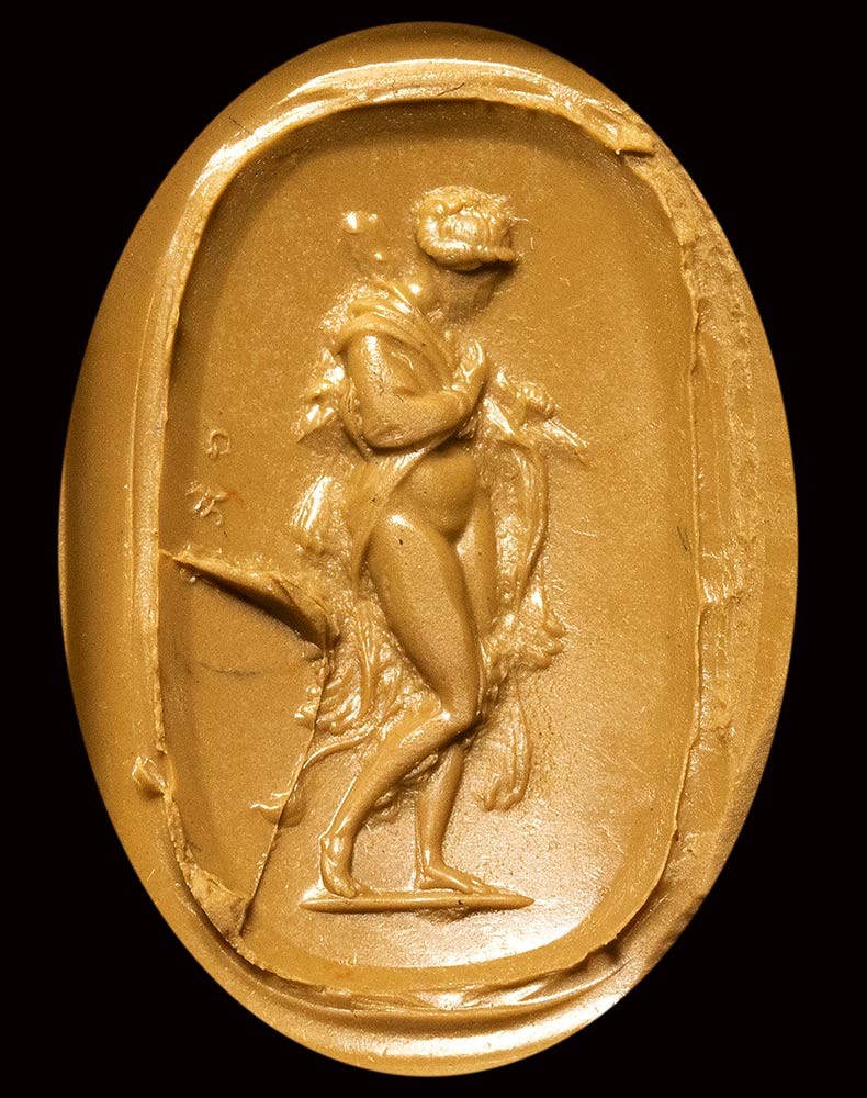 Very fine representation of Omphale, standing and facing left. The young figure holds the club with both hands, and wears the leontea. Every detail is engraved with great technical and artistic mastery. The hair is engraved with great refinement, as the soft anatomical volumes and the pose of the legs, inspired by greek statuary models. Groundline. Presence of two letters in the field. The gem is broken into two pieces, held in place by the ring.
