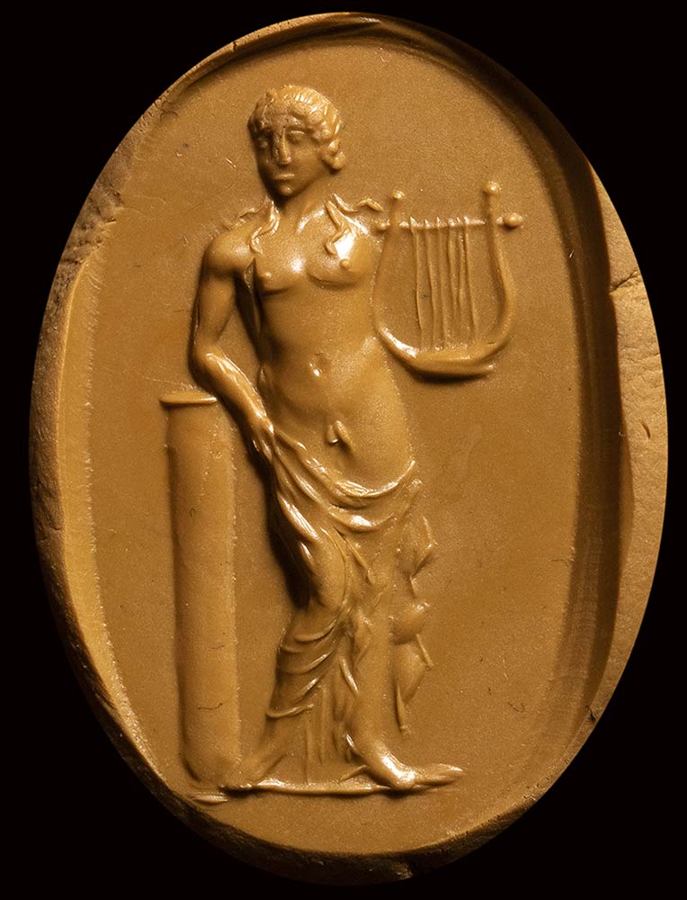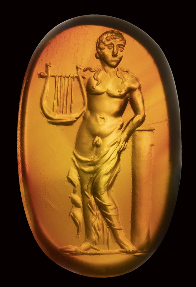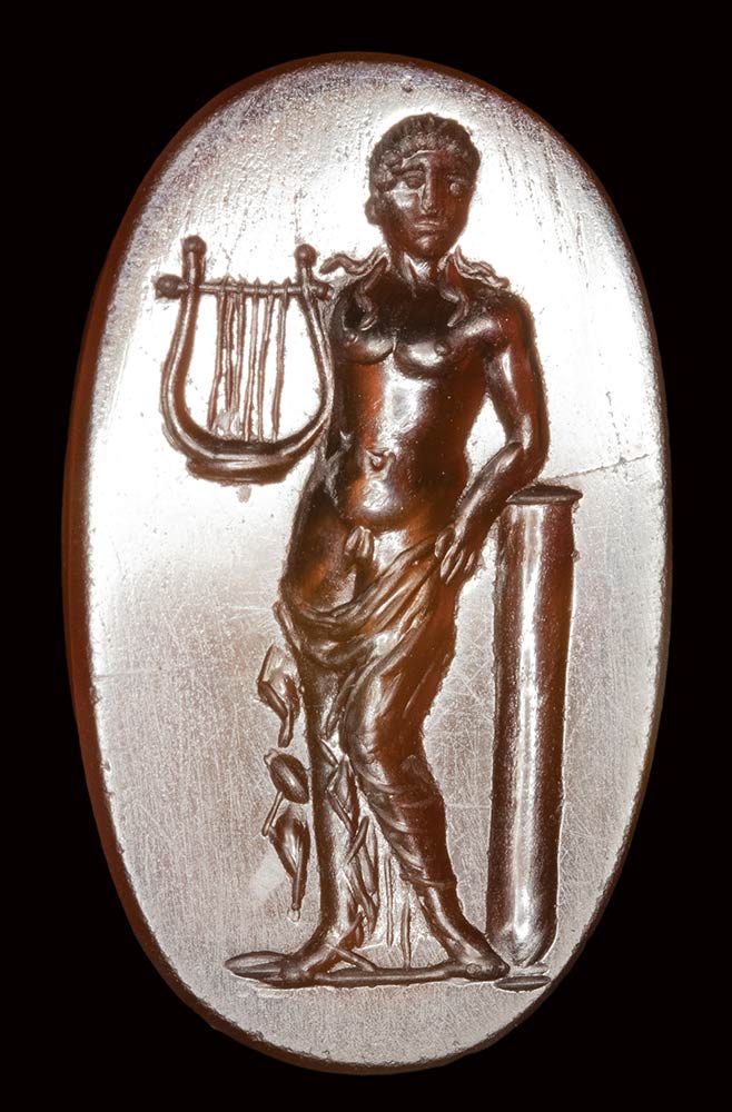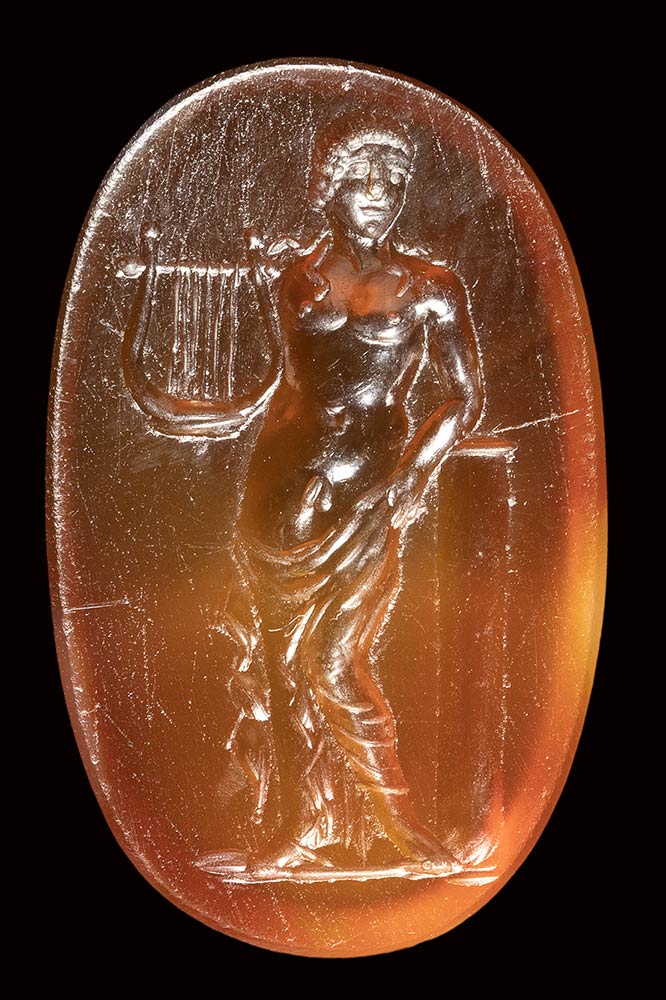 The divinity is standing, with the frontal body and the head turned to the right in three quarters. The god leans on a column with his left arm, while with his right he holds the lyre. The young body is partially draped, with the torso and hips uncovered. The head is characterized by long hair that falls to the shoulders. The pose is elegant, inspired by the hellenistic greek models. Intaglio engraved with great technical and artistic skill. Mirror polishing. Slight wear marks.