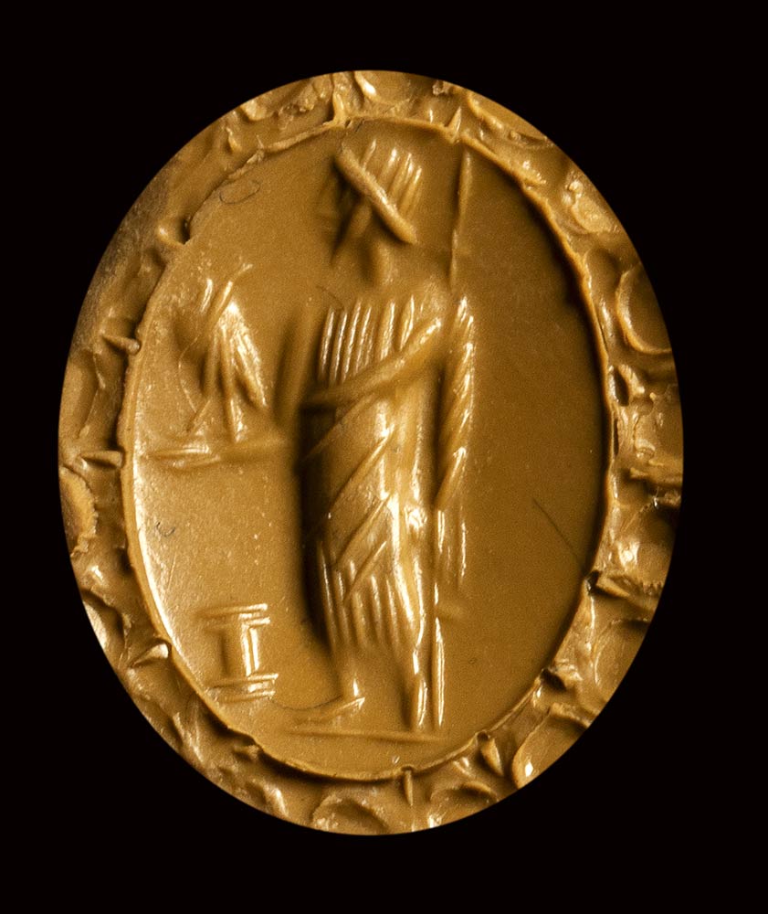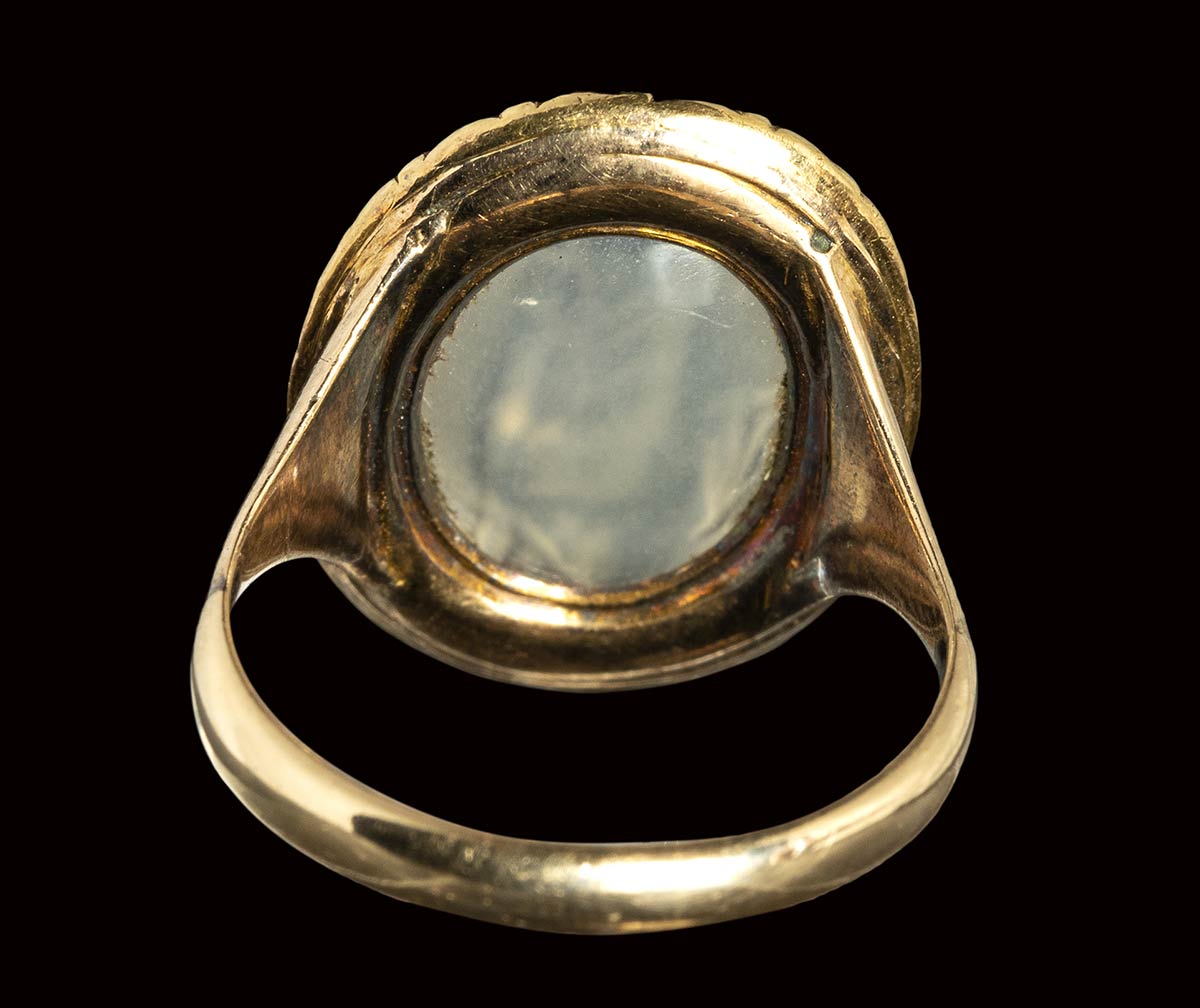 The intaglio depicts Jupiter standing and facing right holding in his left hand and eagle, and a scepter in his right hand. He wears a long cloak, and a band in his hair. In front of him, an altar. Groundline. The 19th century mounting with rounded hoop and a large oval box-setting set with a series of garnet or spinels (one missing) containing the intaglio.