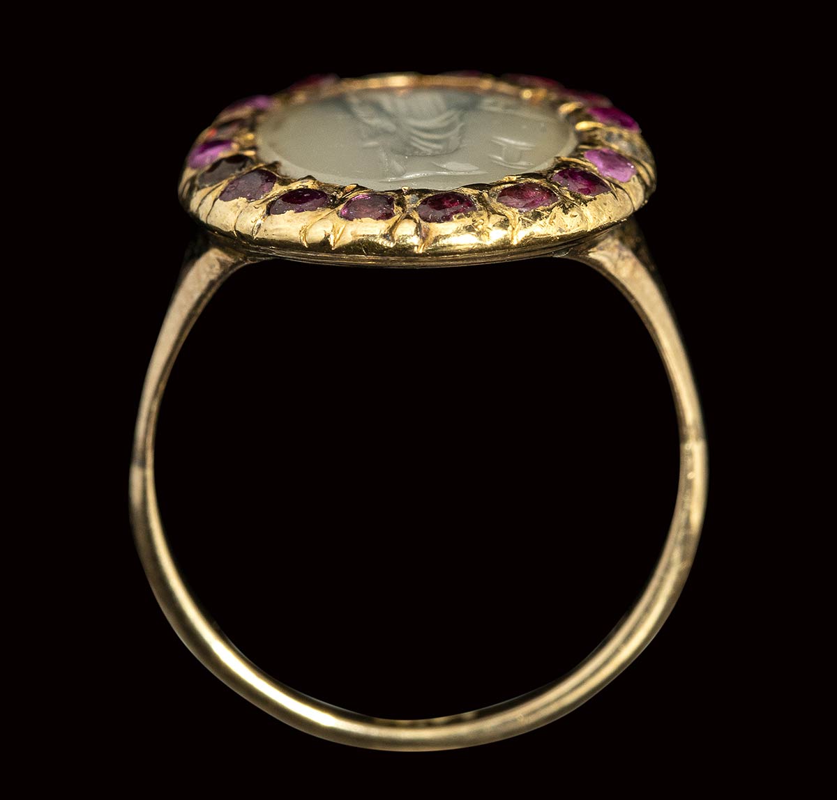 A roman chalcedony intaglio mounted on a 19th century gold ring set with garnets or spinels. Zeus.<br><br>2nd - 3rd century A.D.