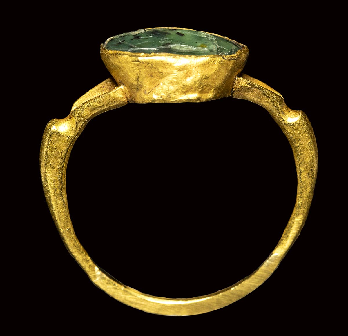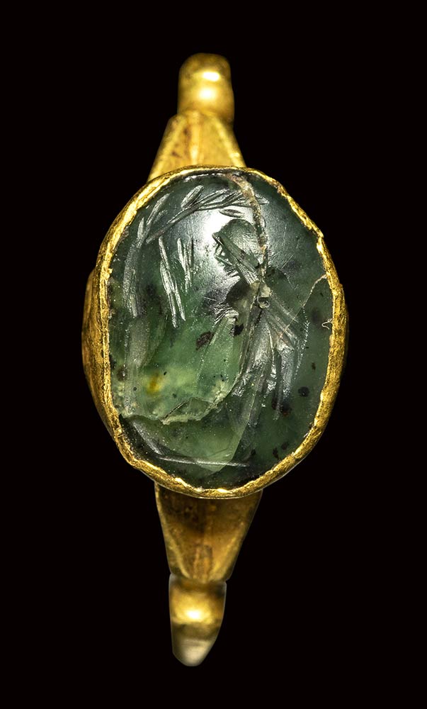 A roman green chalcedony intaglio mounted in a gold ring. Pastoral scene. <br><br>3rd century A.D.