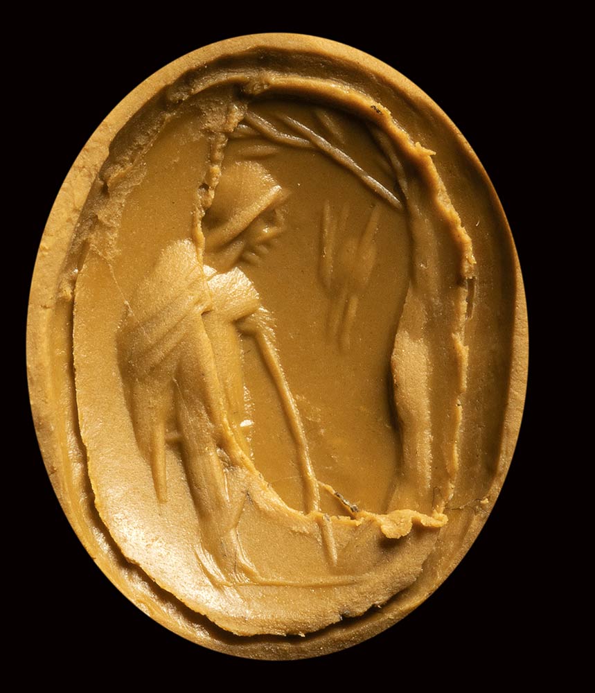 Hoop angular, flat within. The shoulders are fluted and in the form of small leaves. The oval box-setting with conical section is set with an oval green chalcedony intaglio. The scene depicts an old man standing turning left toward a tree. He wears a long cloak and a hat. Groundline. Crack and restoration on the stone.