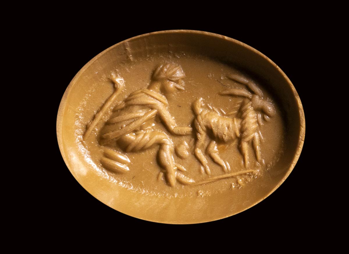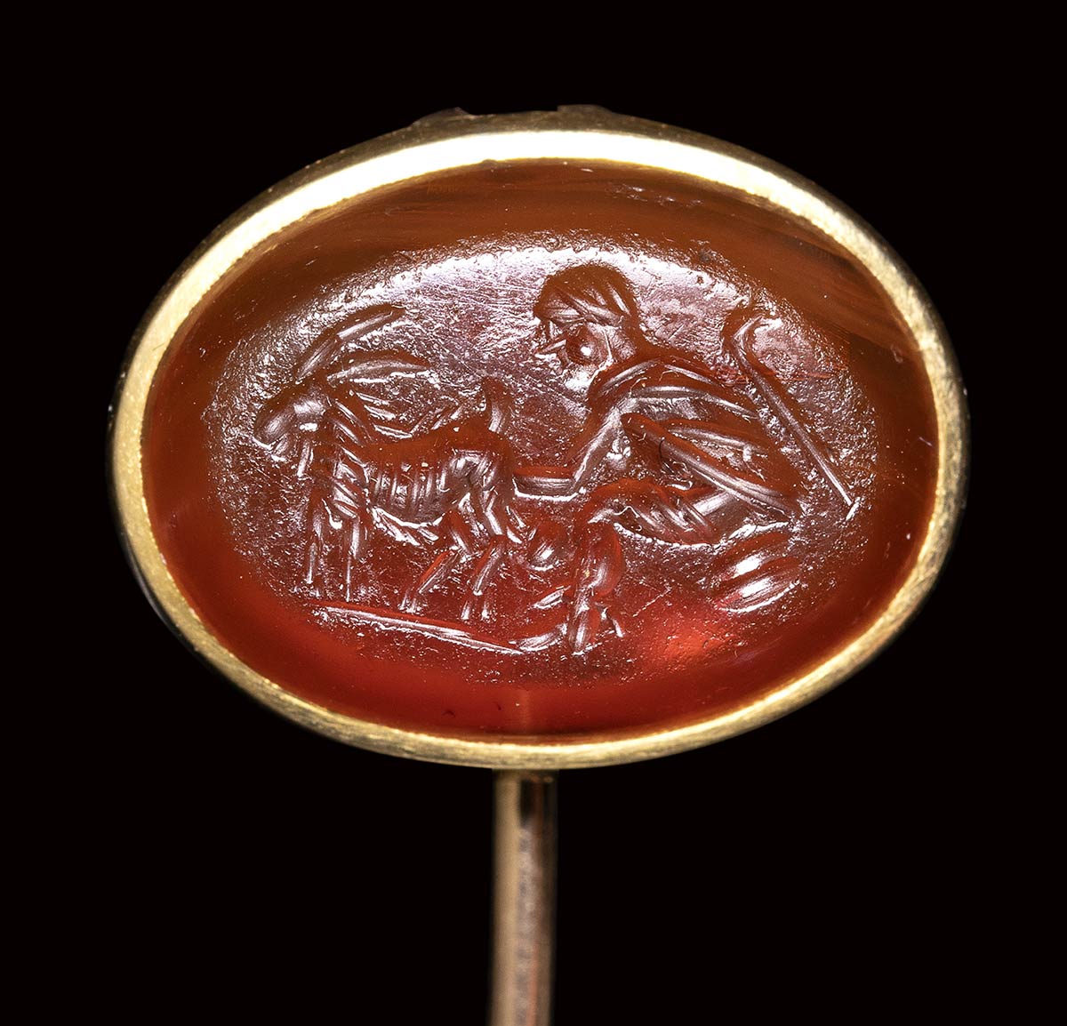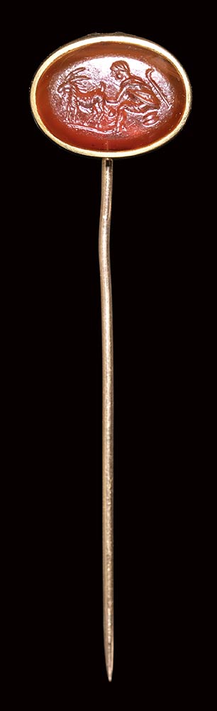 A roman carnelian intaglio set in a gold stick pin. Pastoral scene. <br><br>2nd century A.D.