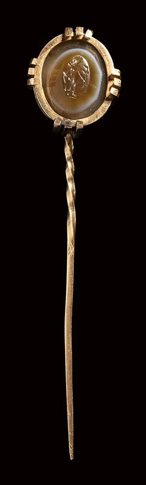 A roman agate intaglio set in a gold stick pin. Apollo.<br><br>2nd - 3rd century A.D.