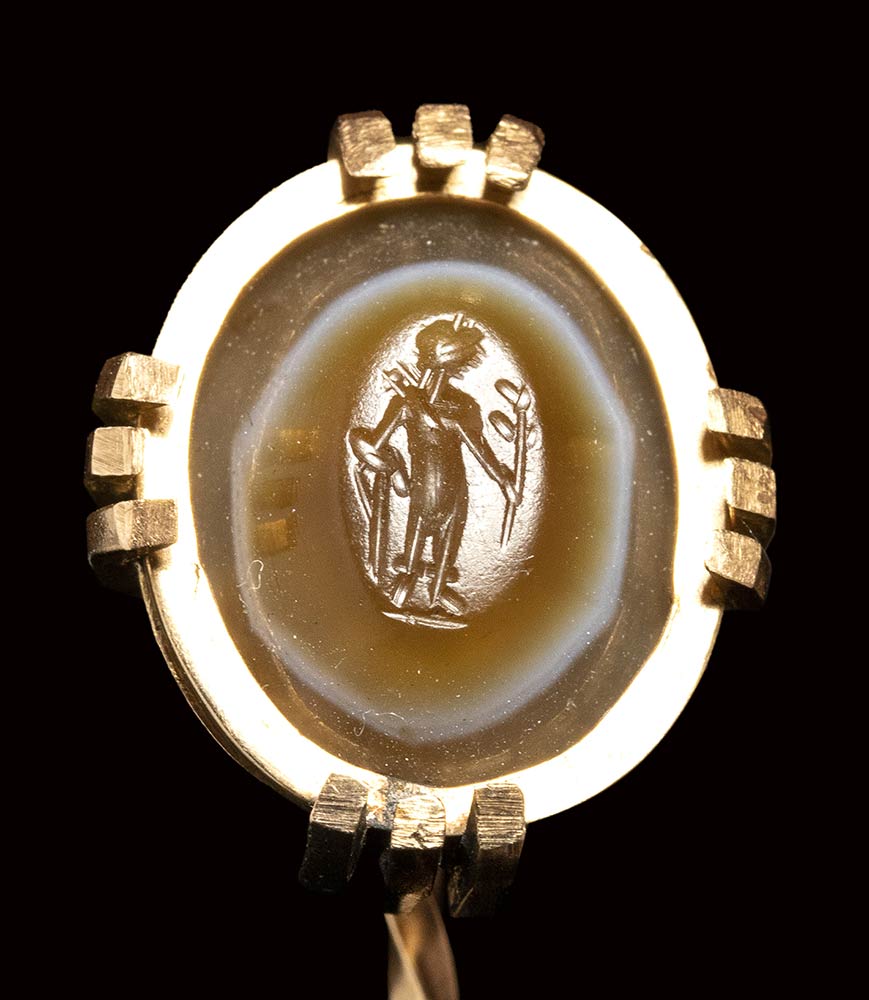The divinity is facing right. In his right hand he holds a drapery, a laurel branch in his left; on his shoulder, a quiver. The subject is engraved on a three-layered agate (magic eye). Very good condition.