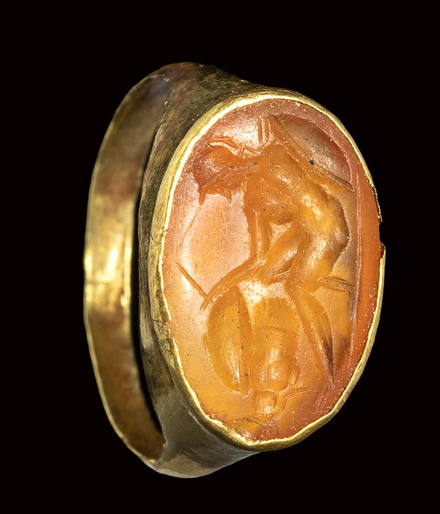 A roman carnelian intaglio set in an ancient gold ring. Warrior.