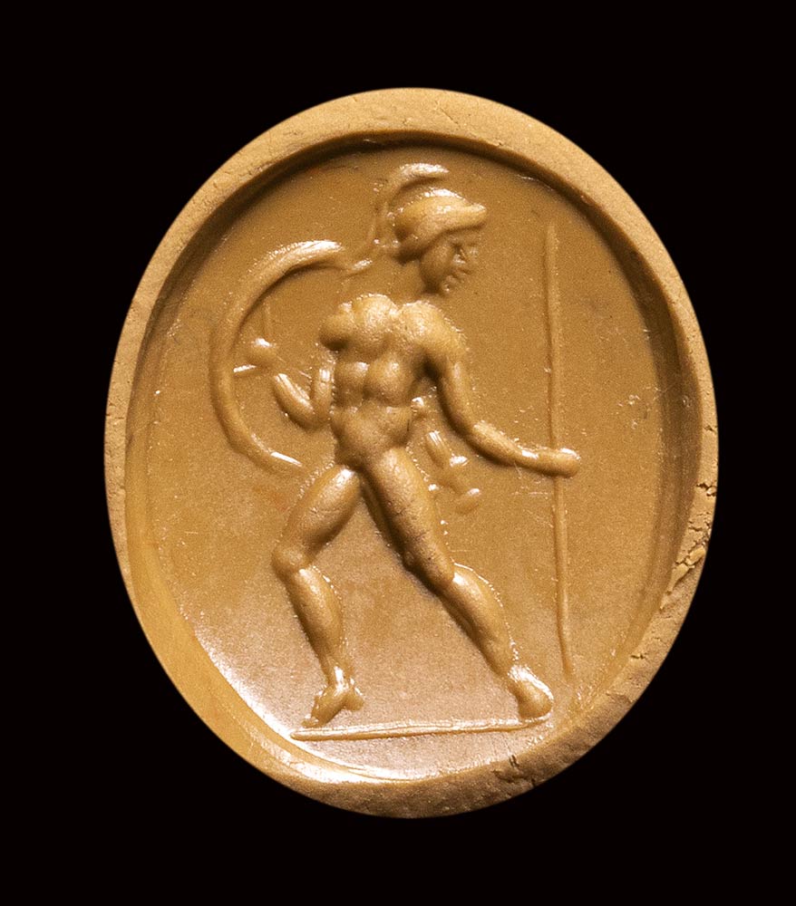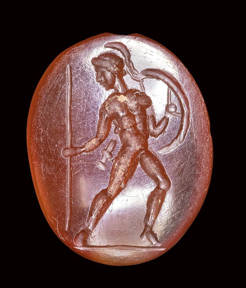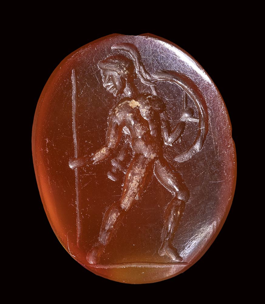 The soldier advances to the right, with the frontal torso and the head turned back in profile. The figure is naked and protected by a shield and helmet. With his right hand he holds the spear; the sword is hung with a belt. Groundline. Typical pose inspired by Greek models. Fine quality for the small size of the stone. Slight wear marks.