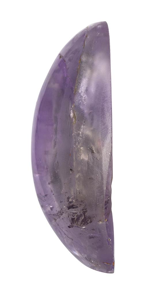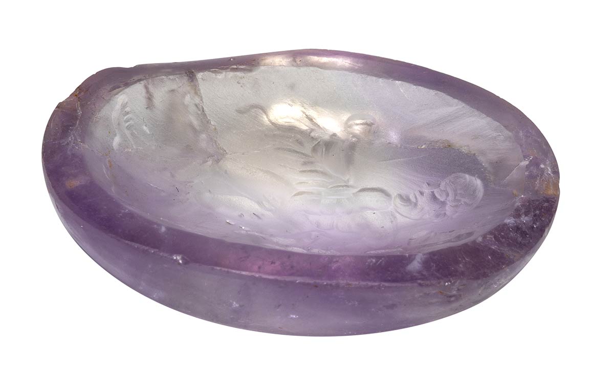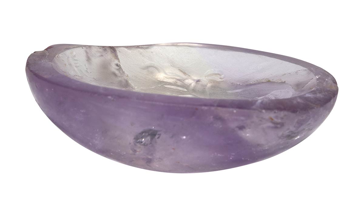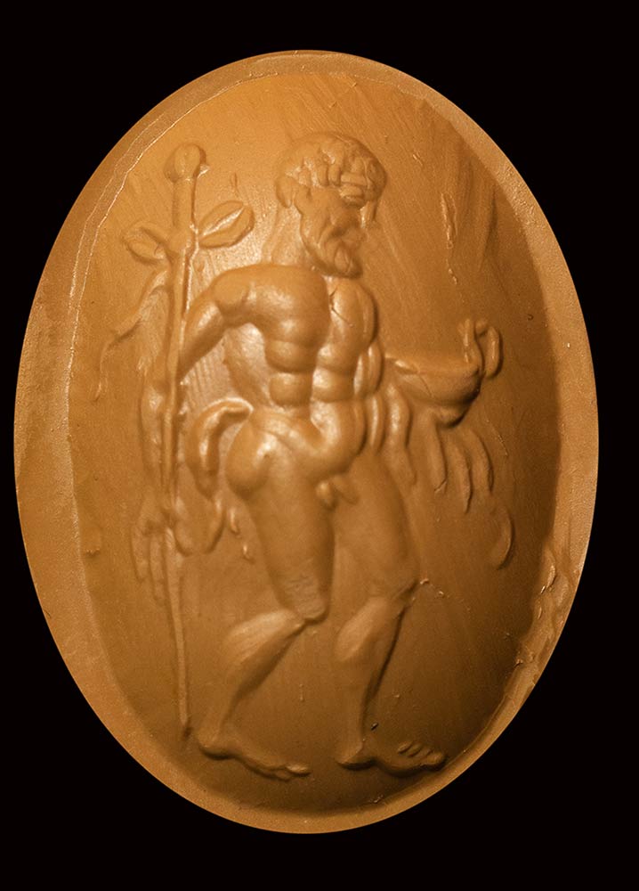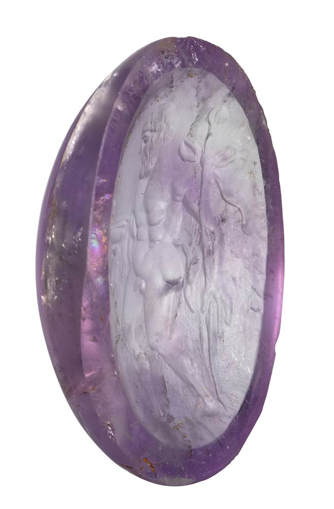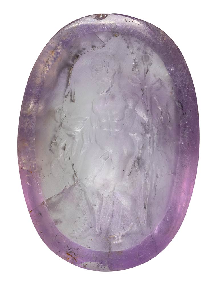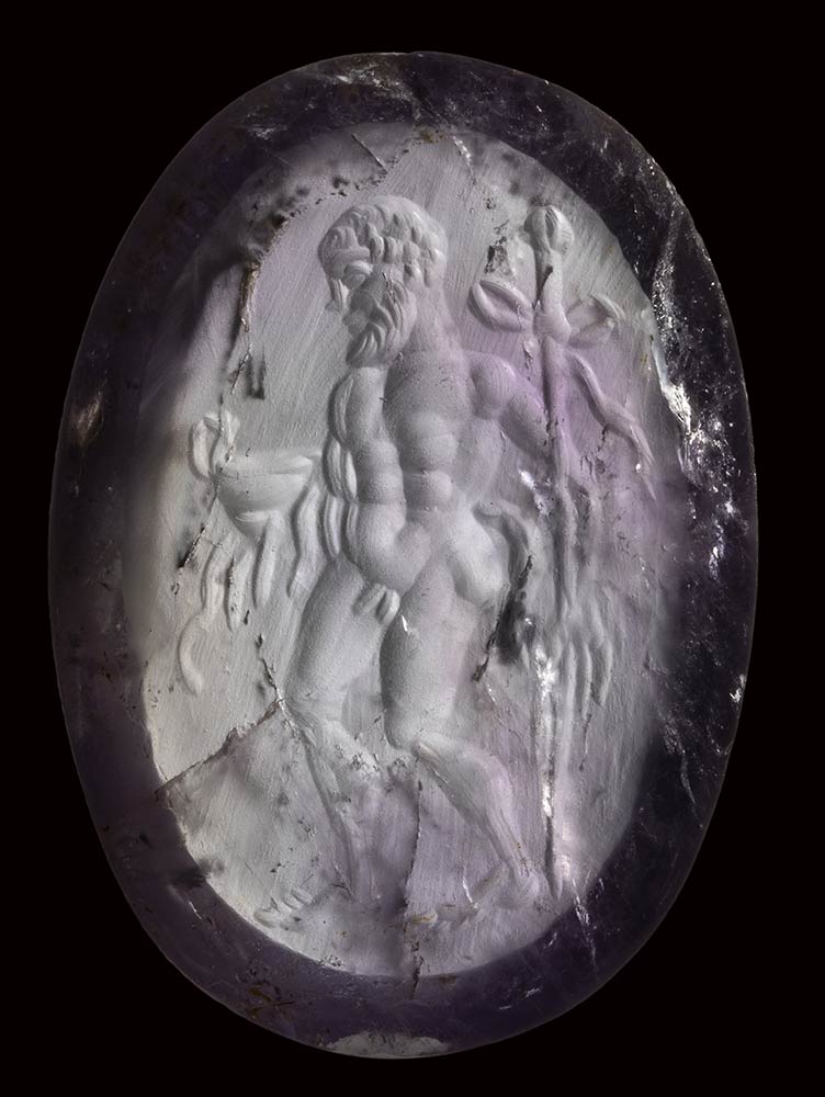 Unusual work, propably from a provincial eastern atelier. A muscular Silenus advances to the left, holding the thyrsus with his left hand and a cup with his right hand. The choice of the amethyst is to be connected to the Dionysiac theme. Large cabochon gem, engraved in the concave inner part. Wear marks.