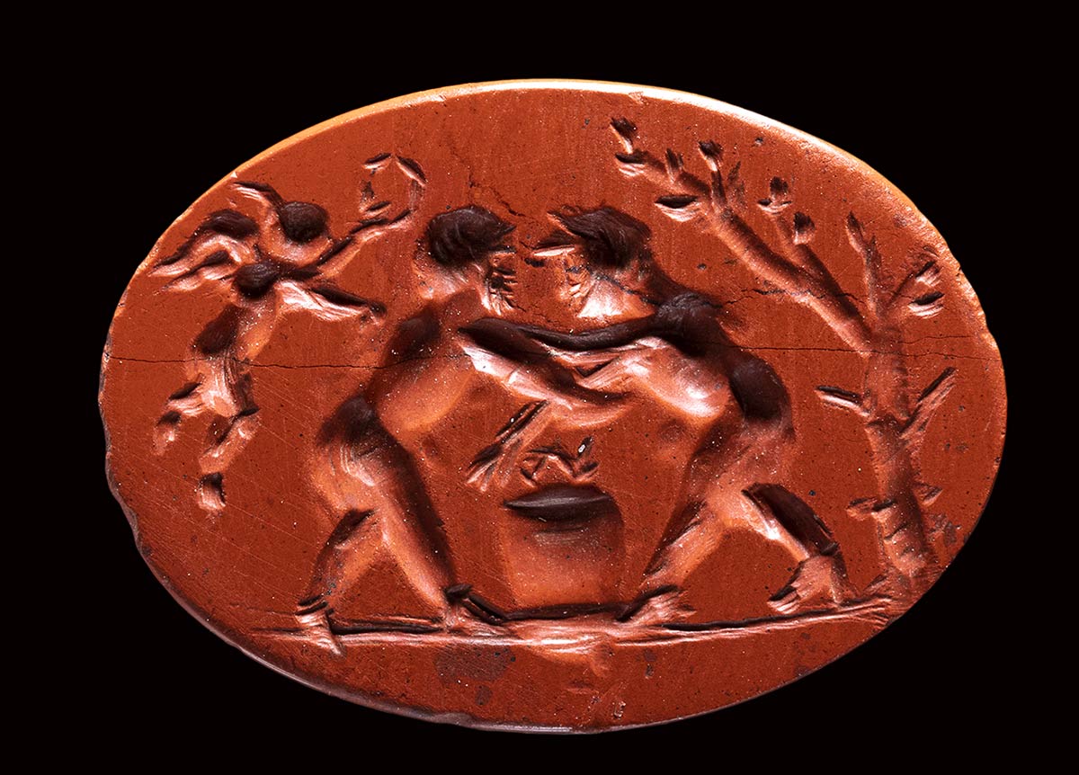 A roman red jasper intaglio. Fight scene. <br><br>2nd - 3rd century A.D.