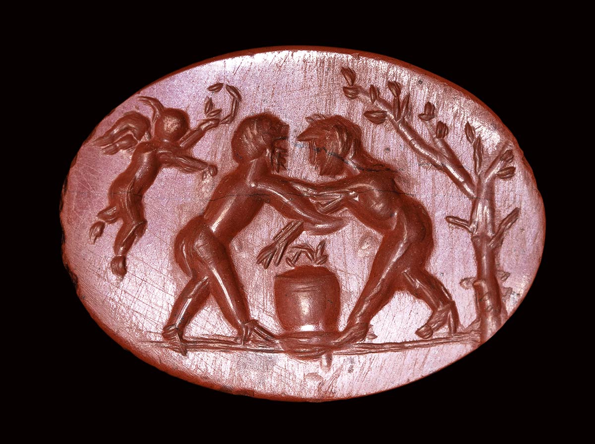 A roman red jasper intaglio. Fight scene.