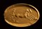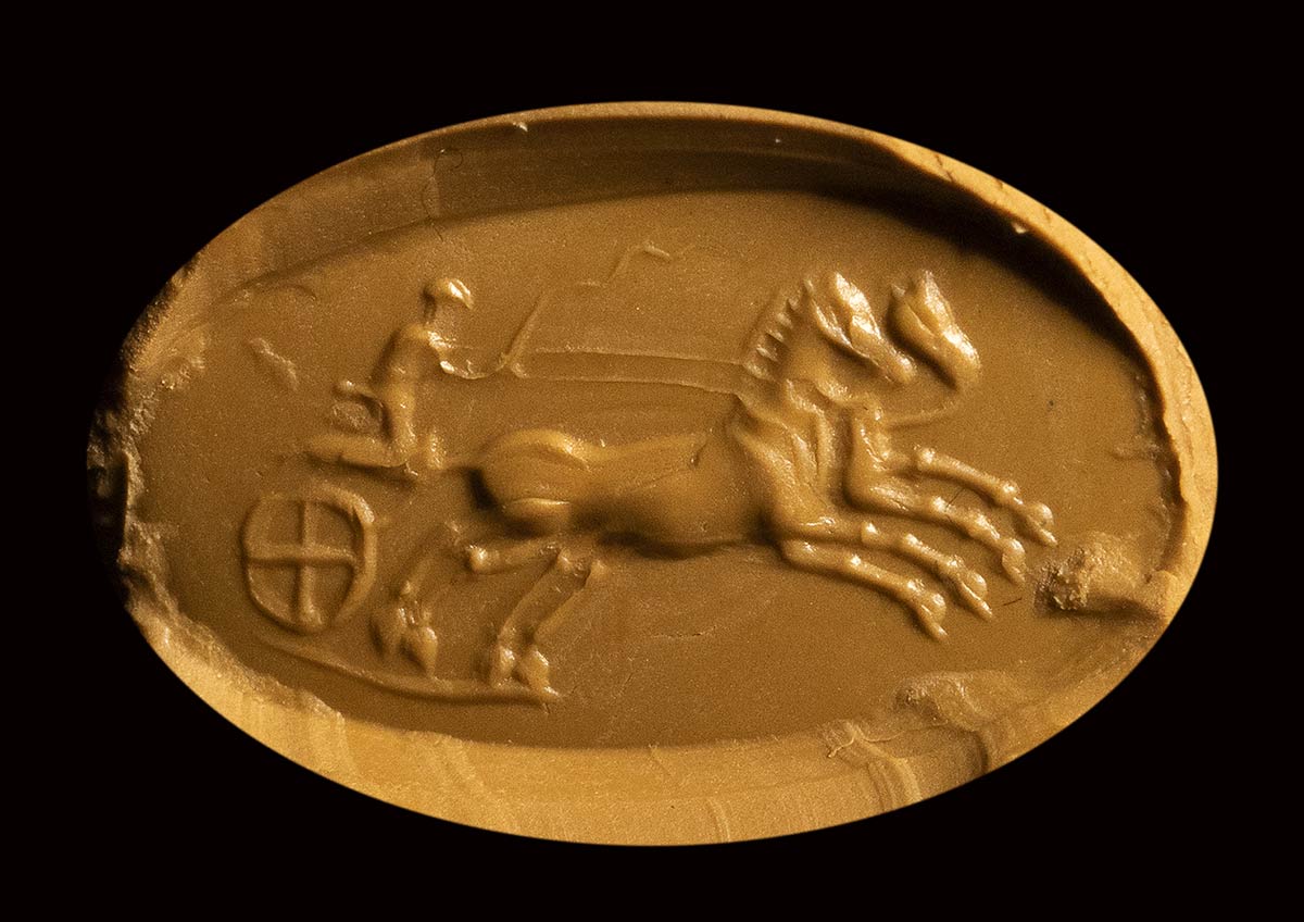 Two horses are running to the left, pulling a small chariot driven by a charioteer with a whip. The stone was heated by the fire. Small chips on the edge.