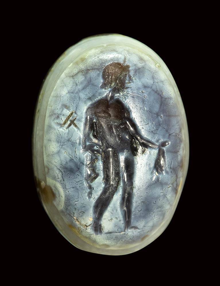 A roman burnt agate intaglio. Mercury.<br><br>2nd century A.D.