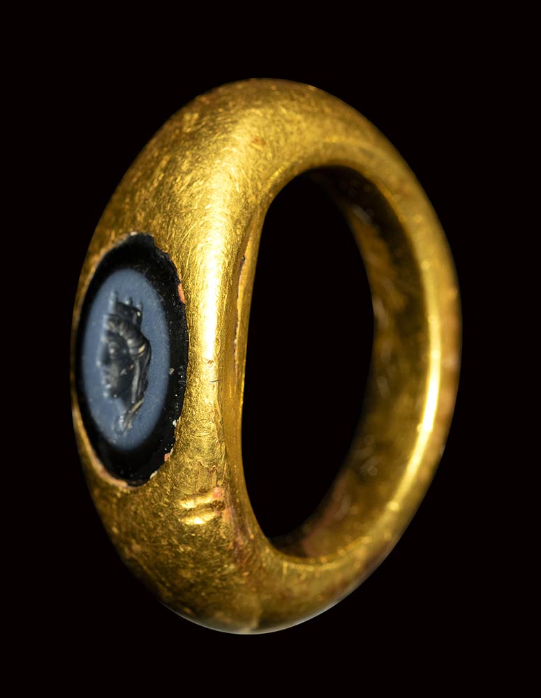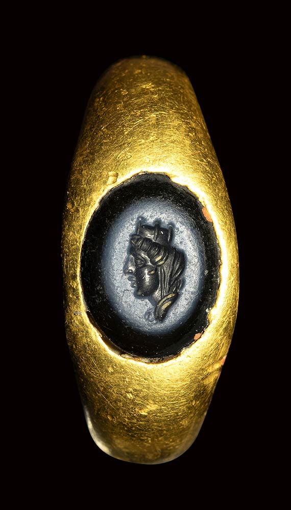 A roman gold ring set with a nicolo intaglio. Portrait of Tyche of Antioch. 2nd - 3rd century A.D.