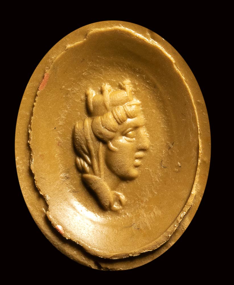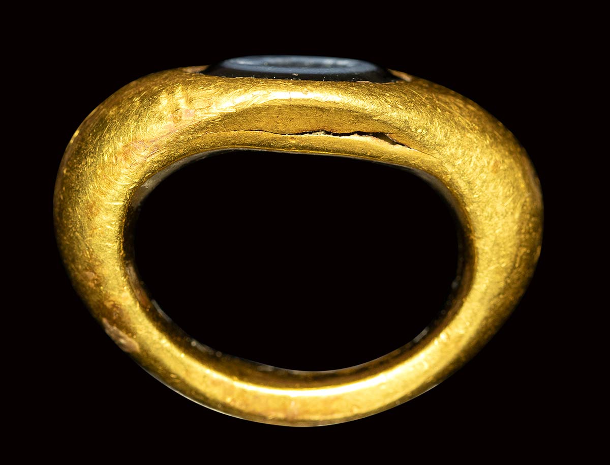 With a large massive elliptical hoop and outbroad shoulders extending into an oval bezel set with a nicolo intaglio. The subject is a portrait of Tyche. Facing left, she wears the crown of Antioch, Syria. Her hair partially veiled. Signs of wears on the surface of the stone and the ring. Slight crack on one side of the ring under the bezel.