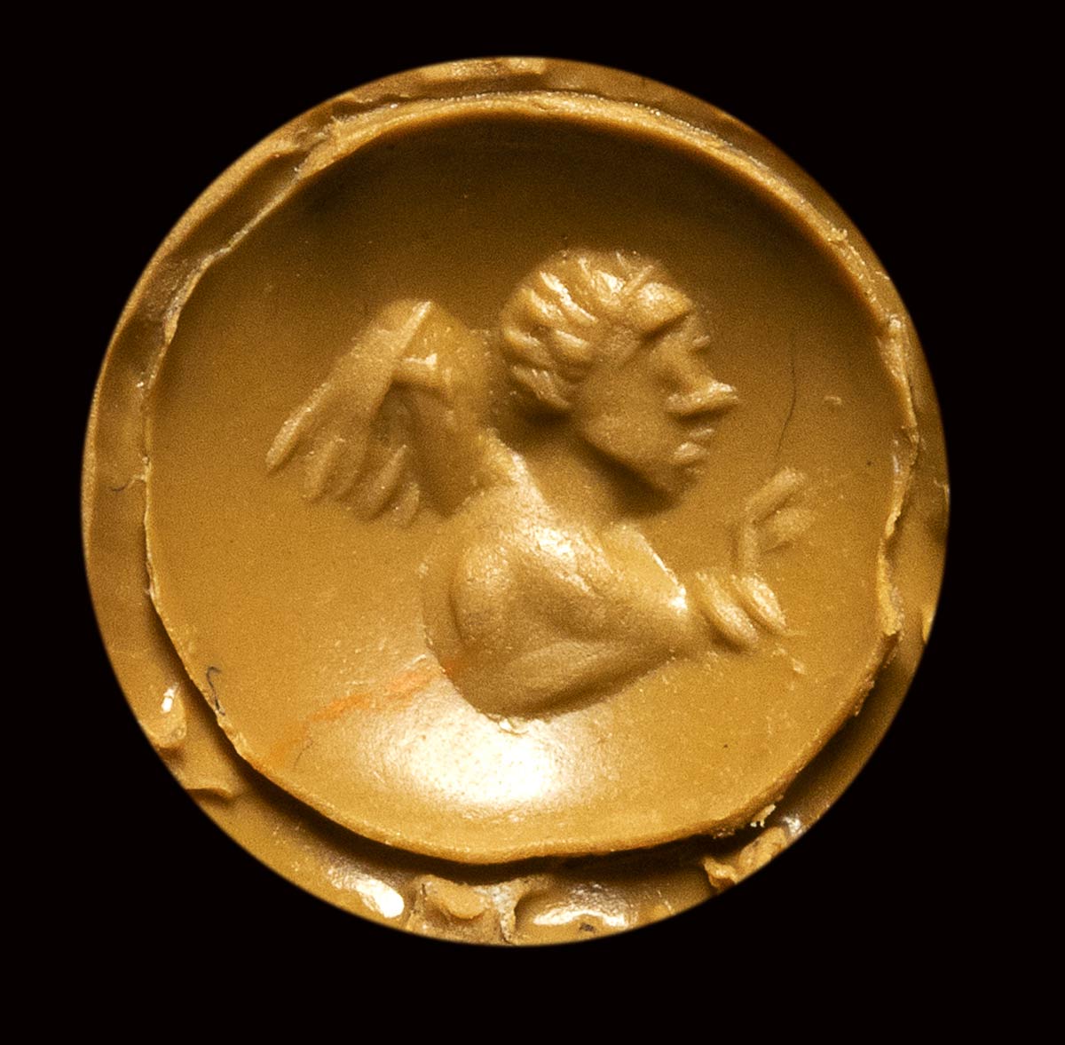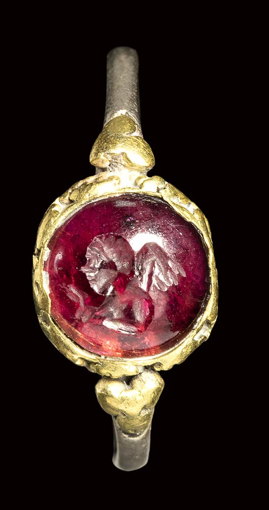 Lotto 182 | A late roman bimetallic ring with garnet cabochon intaglio. Eros. <br><br>3rd century A.D.