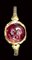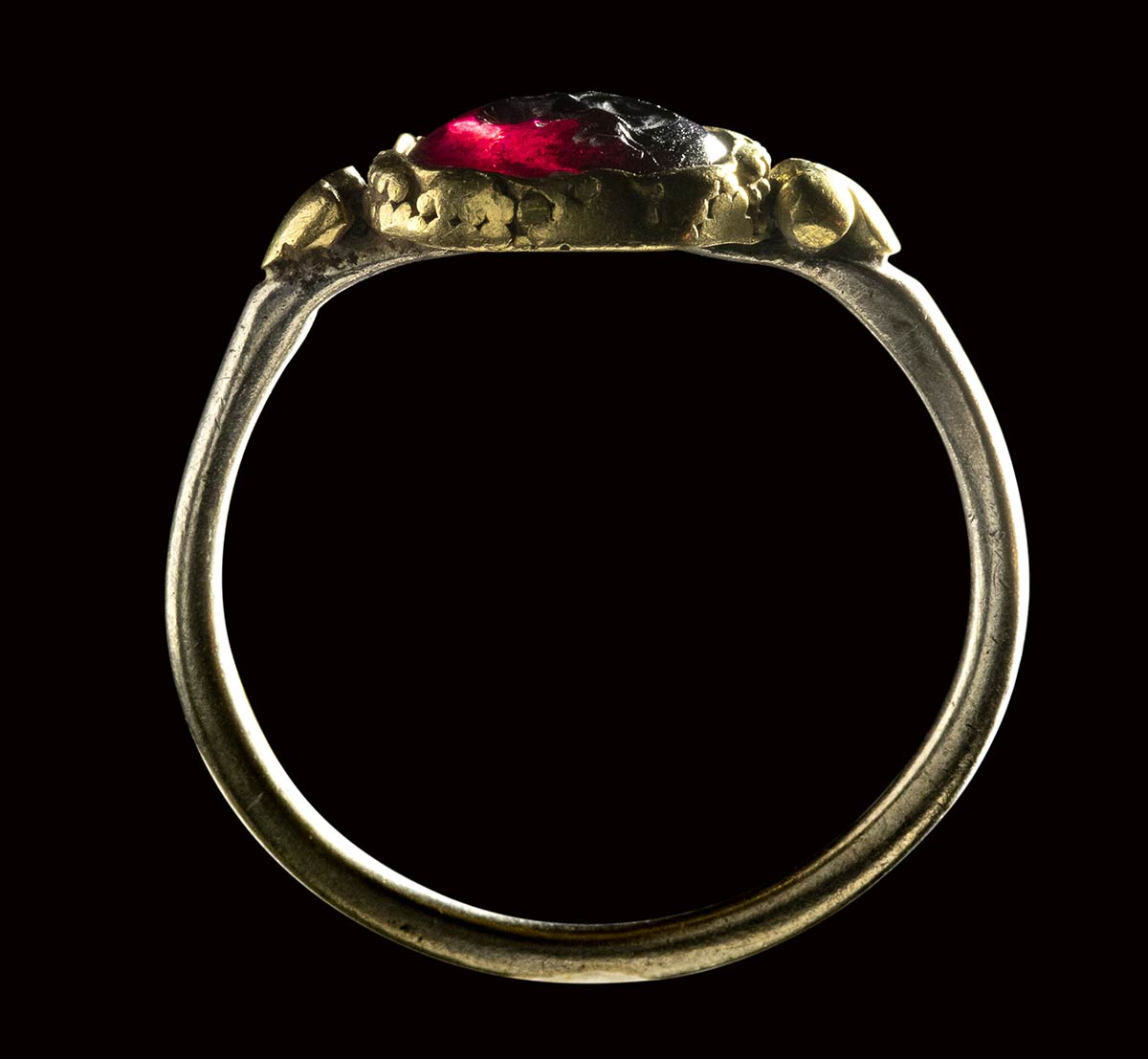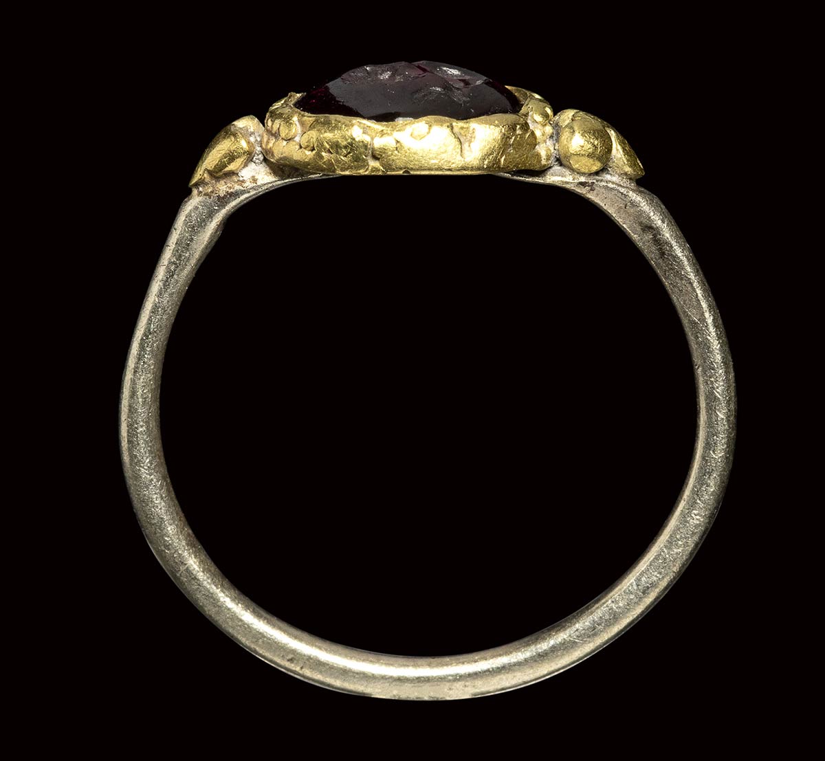 With silver rounded hoop, the shoulders with trefoiled gold beads, and gold rounded bezel set with a garnet cabochon intaglio. The scene depicts a bust of winged eros turned left.