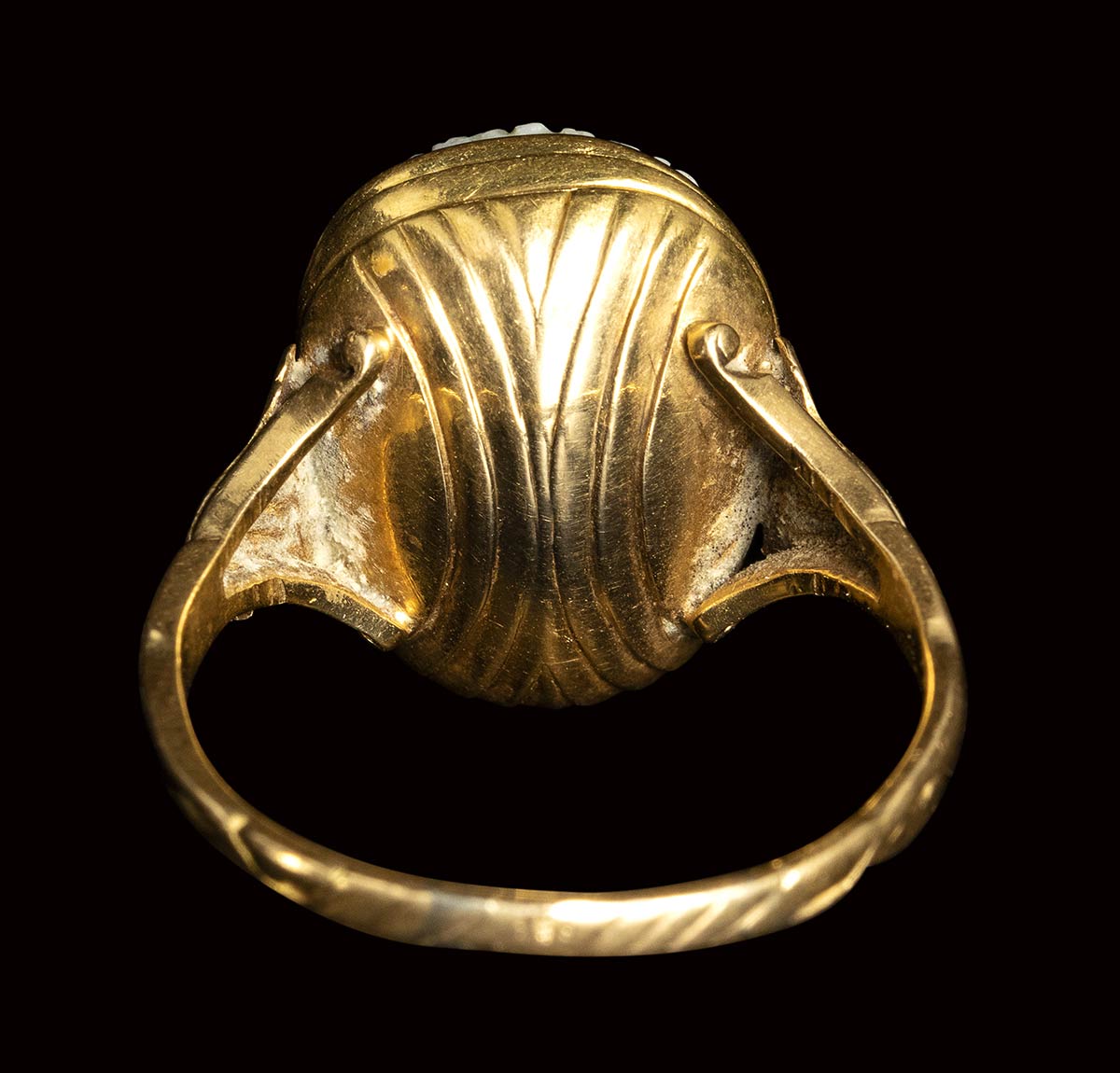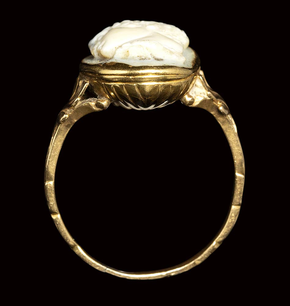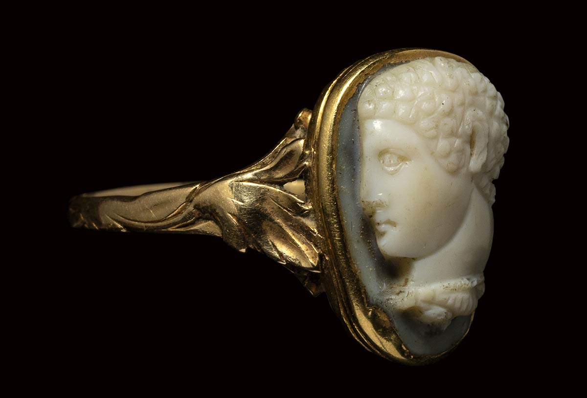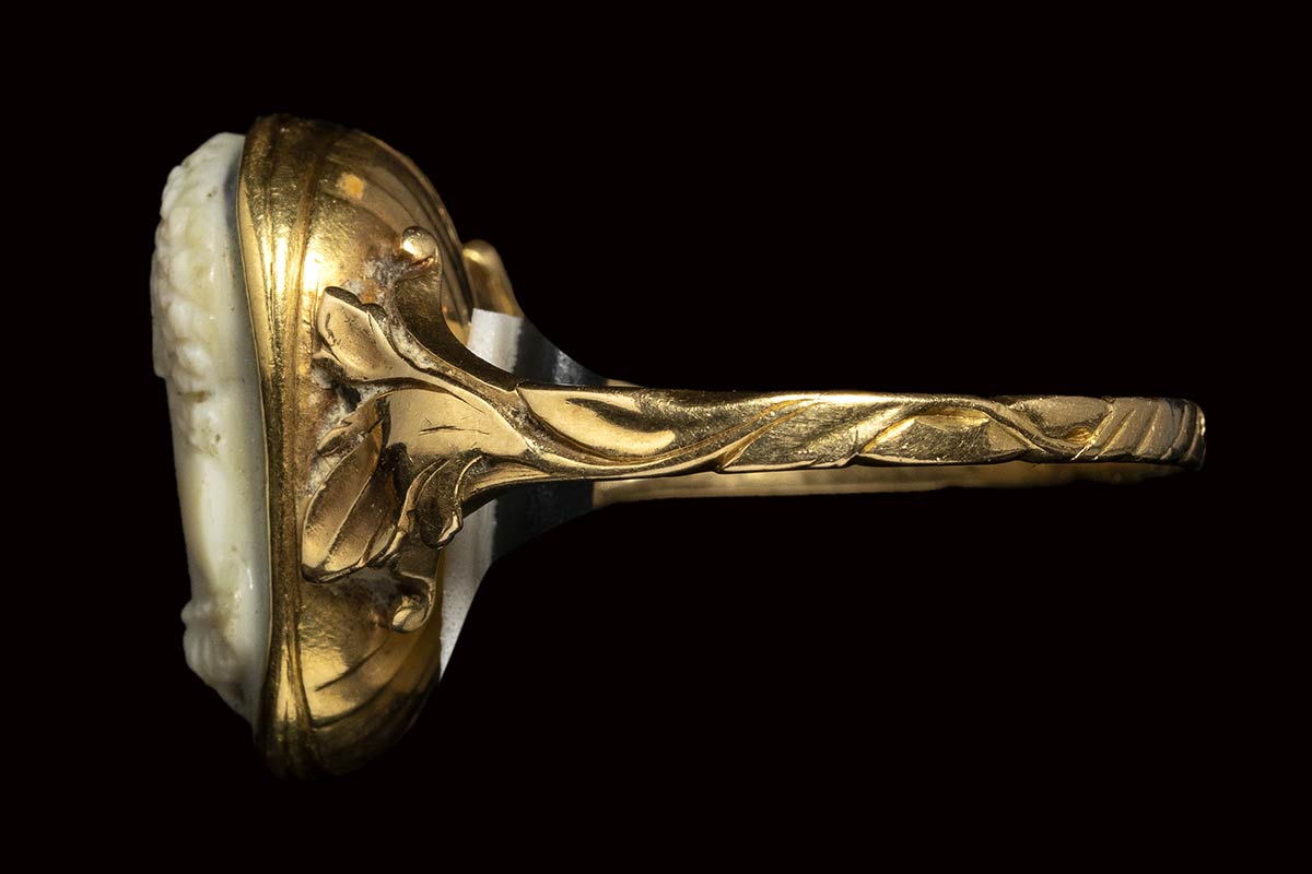 The hero is facing left, in profile, and is characterized by a curly head and by a large neck, with the leontea wrapped around it. The nose is chipped. The edge was probably reshaped in ancient times. The stone is mounted in a beautiful 18th/19th century chiseled gold ring, with the rod decorated with leaves motifs. Wear marks.